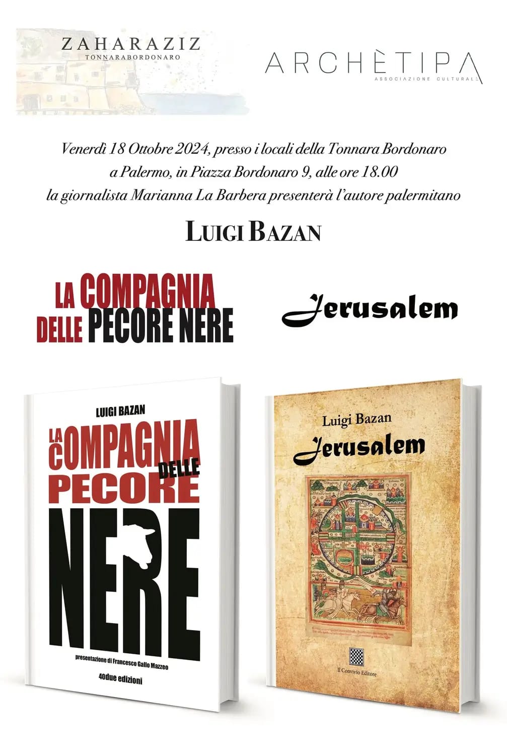 “La compagnia delle pecore nere” e “Jerusalem” sono i titoli delle due opere letterarie di Luigi Bazan che saranno presentate venerdì 18 ottobre alle 18:00 all’Antica Tonnara Bordonaro, in piazza Bordonaro 9 a Palermo.