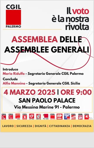 Palermo 28 febbraio 2025 – Lavoro stabile, sicurezza nei cantieri e i 5 sì ai referendum di primavera: di questi temi si parlerà martedì 4 marzo alle ore 9 all’assemblea delle assemblee generali della Cgil Palermo convocata al San Paolo Palace Hotel, in via Messina Marine 91.