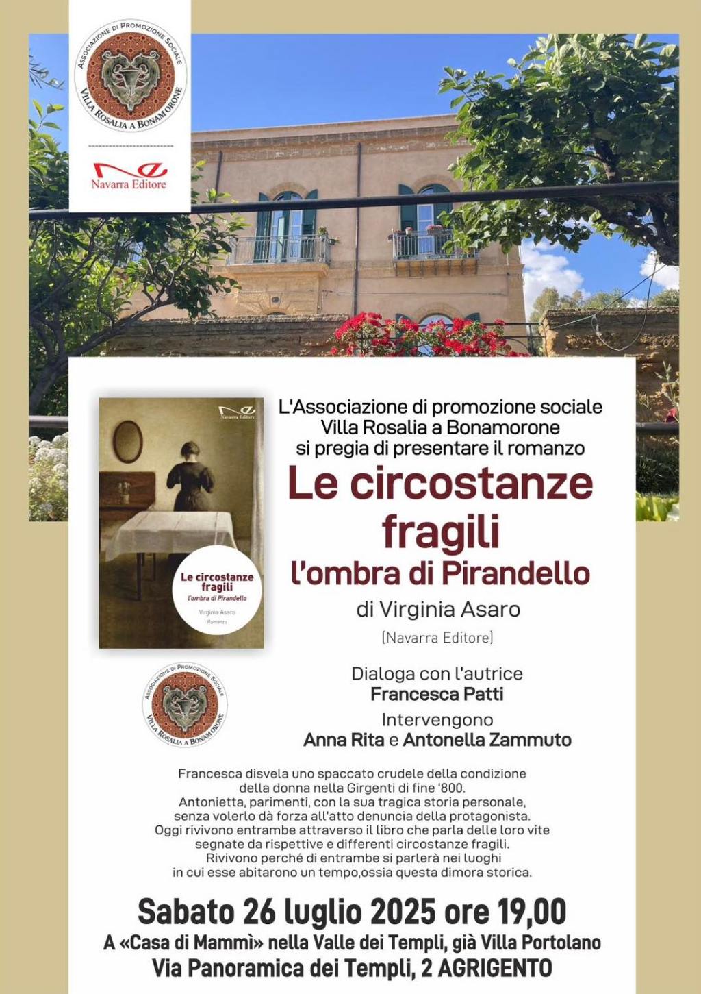 Sabato 26 luglio 2025, alle ore 19:00, l’Associazione di Promozione Sociale Villa Rosalia a Bonamorone ospiterà, nella suggestiva cornice della “Casa di Mammì” (Villa Portolano), nella Valle dei Templi di Agrigento, la presentazione del romanzo “Le circostanze fragili, l’ombra di Pirandello” di Virginia Asaro, edito da Navarra Editore.