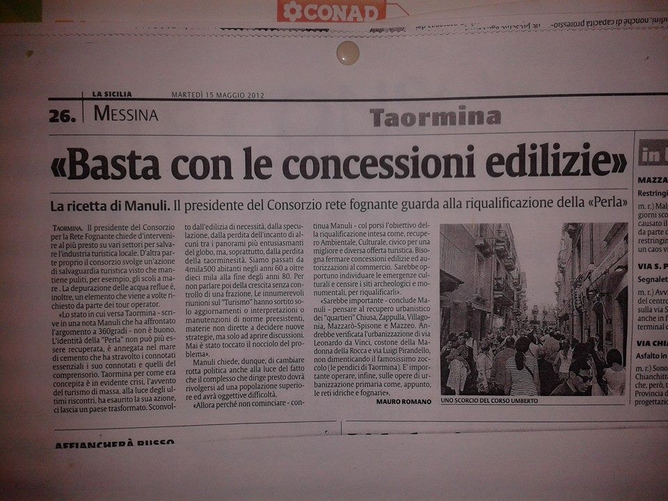 Di interventi efficaci sui grandi problemi che affliggono Taormina nulla : ancora congelato il PUG e non emanato il provvedimento di Tutela del Territorio, si continua ad operare come prima più di prima in tutto il territorio, assordante il silenzio sul dover regolamentare il settore Commercio, e la gestione del patrimonio immobiliare, gran parte arrivato per donazione e che non potrebbe essere alienato in via di principio!