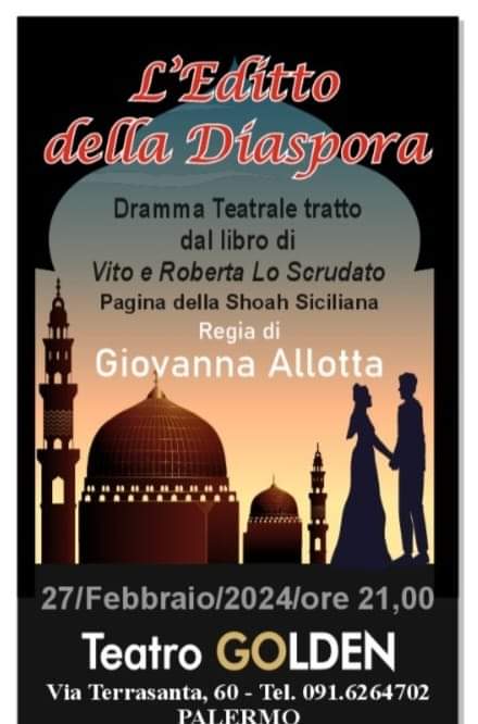 Martedì 27 febbraio alle ore 21 al Teatro Golden (in via Terrasanta, 60 – Palermo) la compagnia teatrale “Il Tesoro Ritrovato” metterà in scena “L’editto della diaspora”, dramma in due atti, con la regia di Giovanna Allotta, tratto dall’omonimo libro scritto da Vito e Roberta Lo Scrudato.