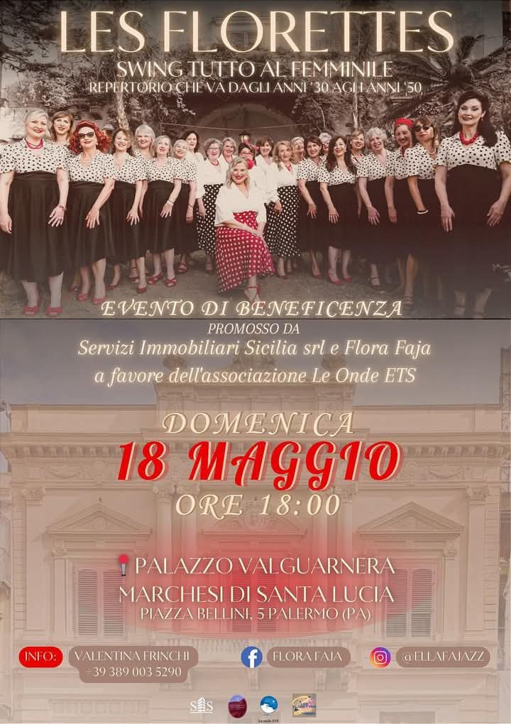 Evento in beneficenza promosso da Servizi Immobiliari Sicilia e Flora Faja a favore dell’Associazione Le Onde Ets, organizzazione no profit per prevenire e contrastare la violenza maschile verso le donne, le bambine e i bambini partendo dal desiderio di libertà delle donne. Per questo motivo le coriste si esibiranno indossando scarpe rosse come simbolo contro il fenomeno del femminicidio oltre che un abbigliamento che richiama all’epoca dello swing.