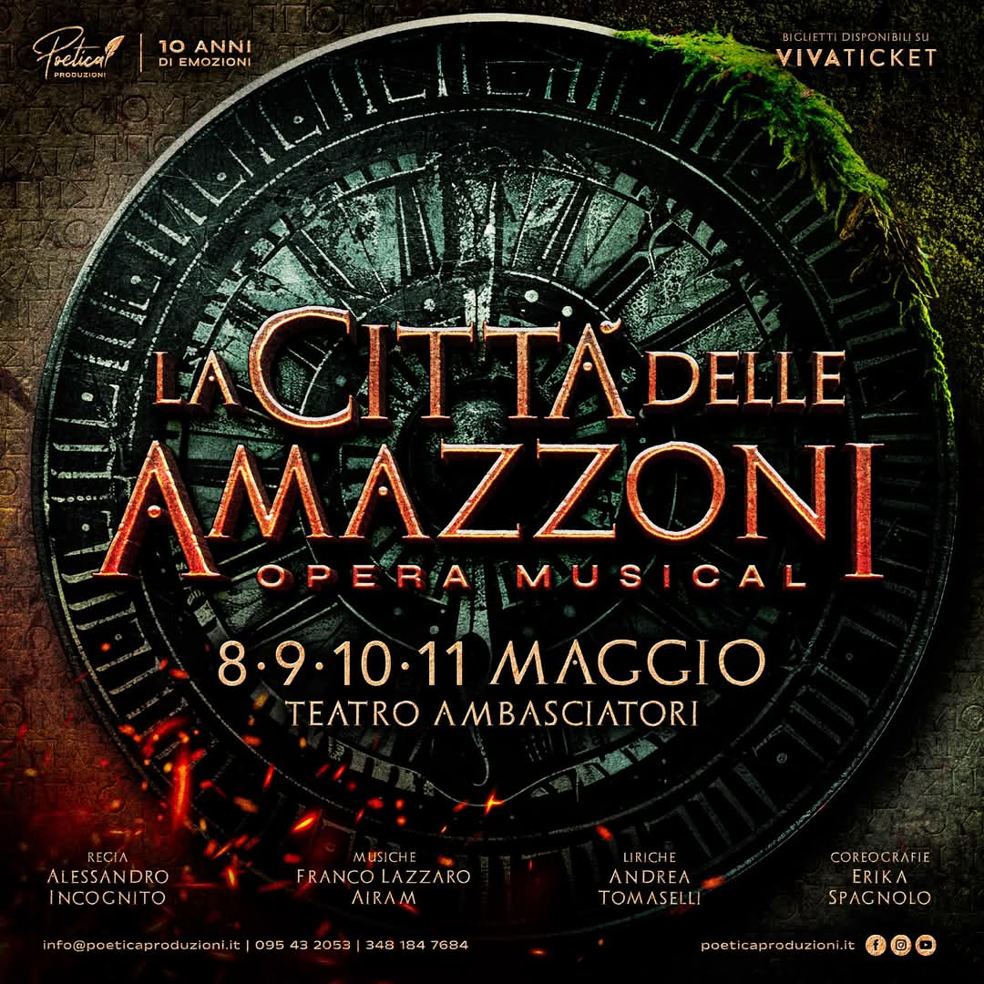 Catania- Una nuova imponente messa in scena, da giovedì 8 maggio, alle ore 21, in prima nazionale, con repliche venerdì 9, alle ore 21.00, sabato 10, alle ore 21.00 e domenica 11, alle ore 18.00, sul palco del Teatro Ambasciatori, la casa del musical siciliano, vedrà la Compagnia Poetica Produzioni, diretta da Alessandro Incognito, incantare e stupire il pubblico di tutte le età con l’inedita messa in scena de “La città delle Amazzoni- Opera Musical”.