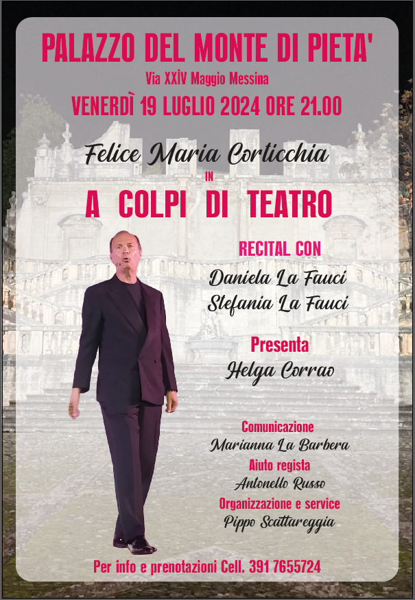 “A colpi di teatro” scritto, diretto e interpretato da Felice Maria Corticchia approda a Messina dove si terrà venerdì 19 luglio alle 21:00 al Palazzo del Monte di Pietà, in via XXIV Maggio.