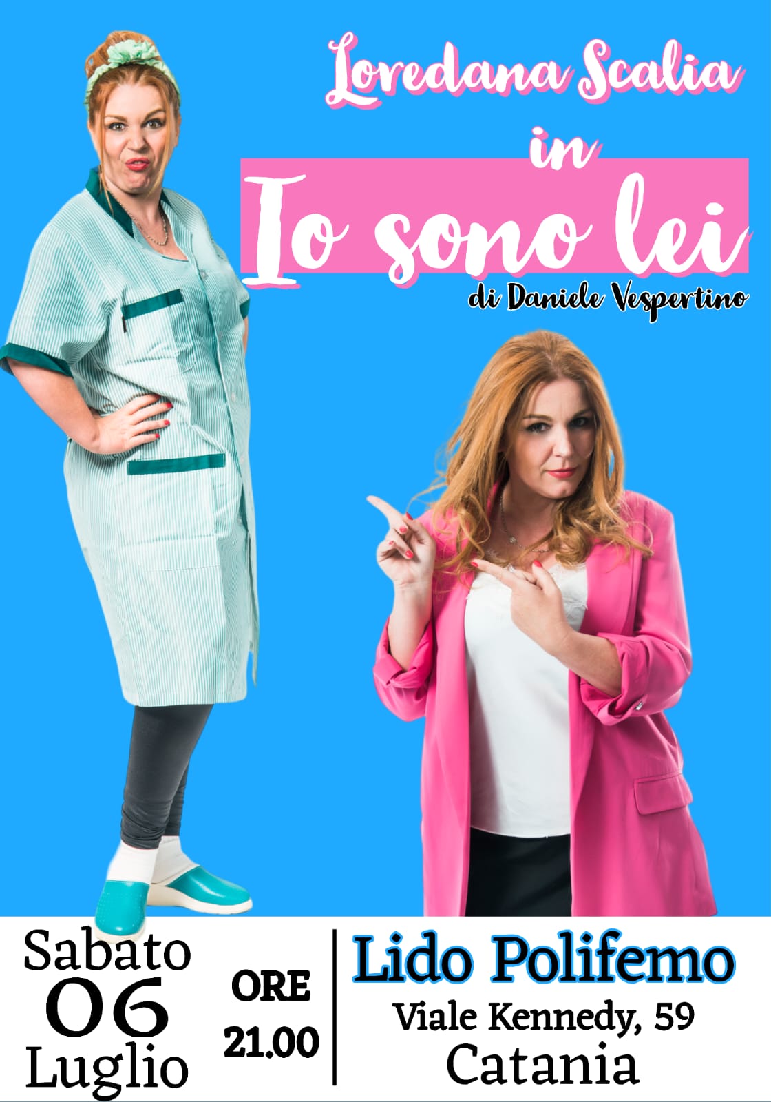 Da questo pensiero semplice si allarga l’idea di “Io sono lei”, lo spettacolo, scritto da Daniele Vespertino, che l’attrice comica porterà il 6 luglio alle 21 al lido Polifemo di Catania in viale Kennedy 59.
