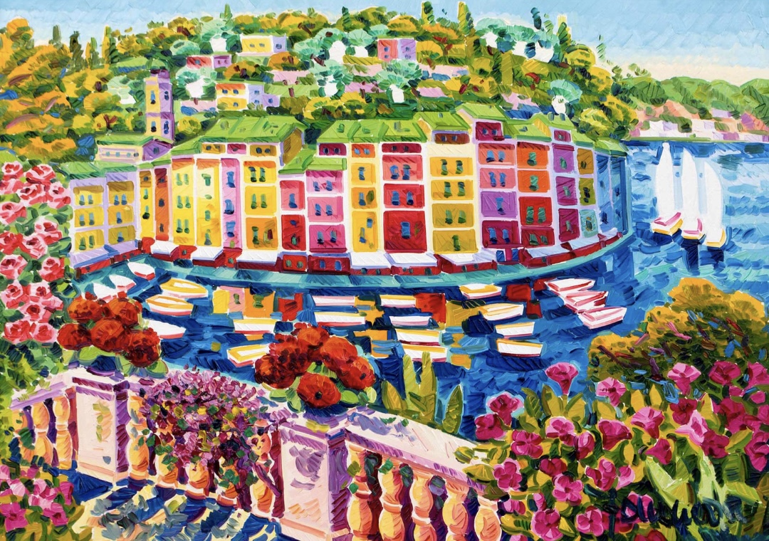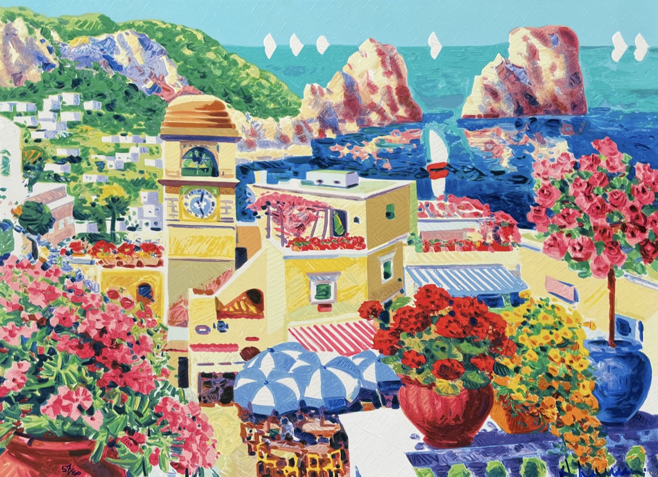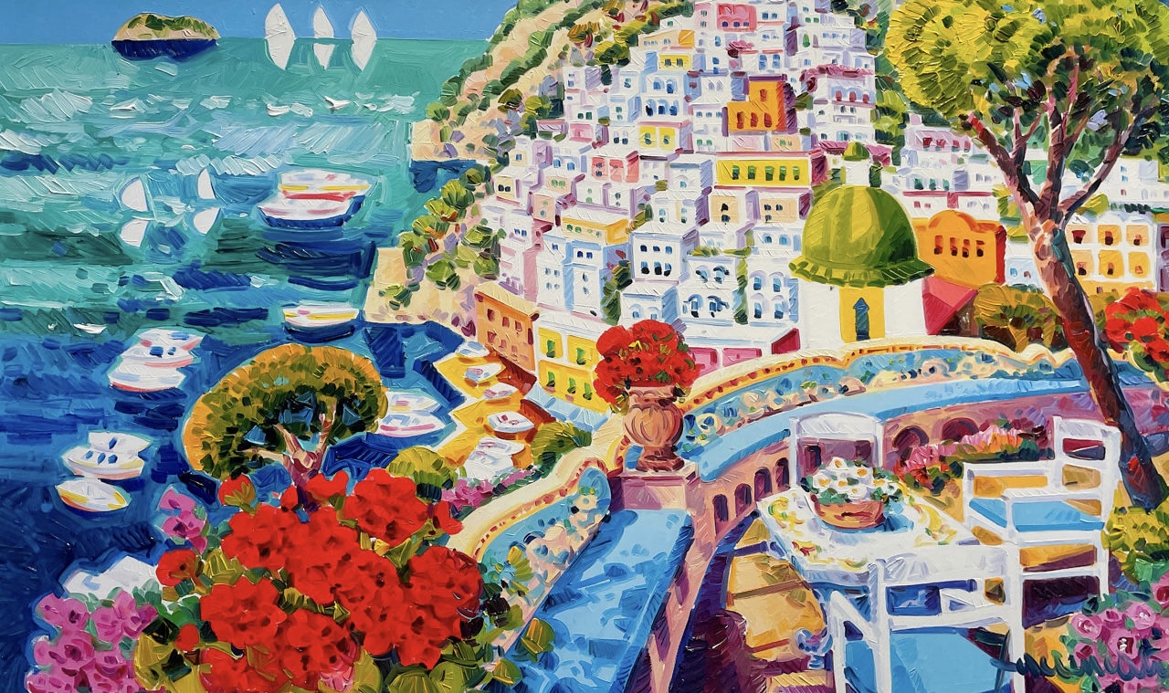 I colori divennero puri e brillanti, ideali per rappresentare quei paesaggi mediterranei che Athos Faccincani ha ammirato con i suoi stessi occhi quali Positano, Capri, Polignano, Portofino, Santorini e altre isole greche.