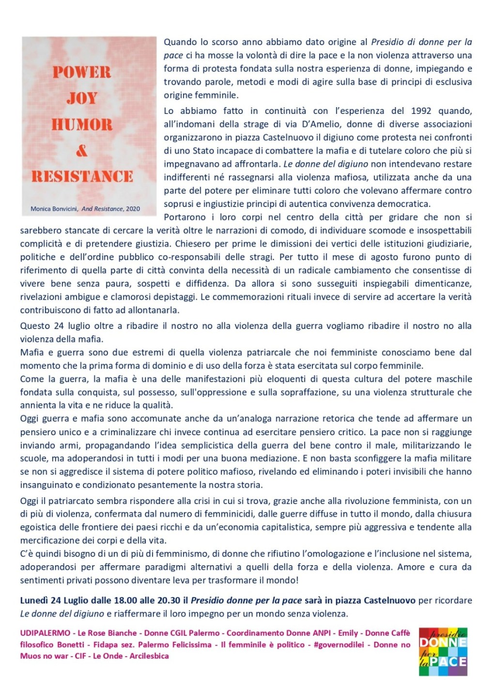 Lunedì 24 Luglio dalle 18.00 alle 20.30 il Presidio donne per la pace sarà in piazza Castelnuovo #Palermo per ricordare Le donne del digiuno e riaffermare il loro impegno per un mondo senza violenza.