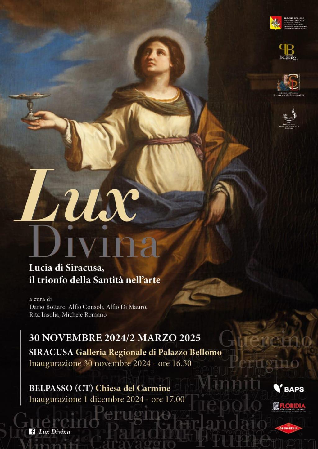 Sabato 30 novembre alle ore 16,30 alla Galleria Regionale di Palazzo Bellomo di Siracusa si inaugurerà “Lux Divina – Lucia di Siracusa, il trionfo della Santità nell’arte”, a cura di Dario Bottaro, Alfio Consoli, Alfio Di Mauro, Rita Insolia e Michele Romano. La mostra celebra la venuta del corpo di santa Lucia a Siracusa e la conclusione dell’anno Luciano e attesta la devozione nel mondo per la santa. La Galleria riceverà per l’occasione da diversi edifici di culto e spazi museali le opere di artisti di fama internazionale, da Ghirlandaio al Guercino, a Filippo Paladini, Giambattista Tiepolo ma anche il siciliano moderno Salvatore Fiume e tanti altri. È stata pensata come una mostra diffusa infatti l’esposizione dialoga con Belpasso, cittadina alle pendici dell’Etna, in cui è vivo il culto di Santa Lucia e che ospiterà anch’essa nel mese di dicembre le sacre spoglie della martire siracusana. La mostra è organizzata in due sedi distinte: la Galleria Regionale di Palazzo Bellomo a Siracusa e la Chiesa del carmine di Belpasso: due percorsi differenti che evidenziano la Luce di santa Lucia, con opere scelte e contestualizzate.