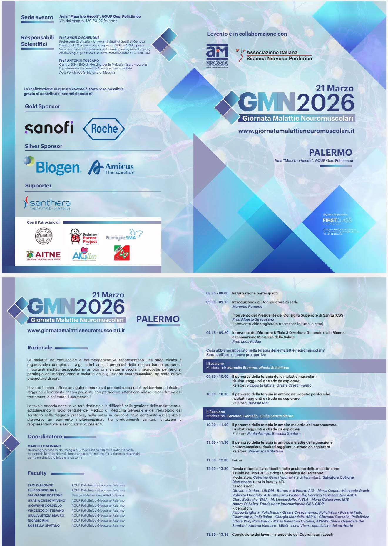 A Palermo, la giornata si svolgerà presso l’Aula “Maurizio Ascoli” dell’AOUP Policlinico e riunirà specialisti, ricercatori, rappresentanti delle istituzioni sanitarie e delle associazioni dei pazienti per un confronto multidisciplinare sulle sfide cliniche e organizzative delle malattie neuromuscolari.