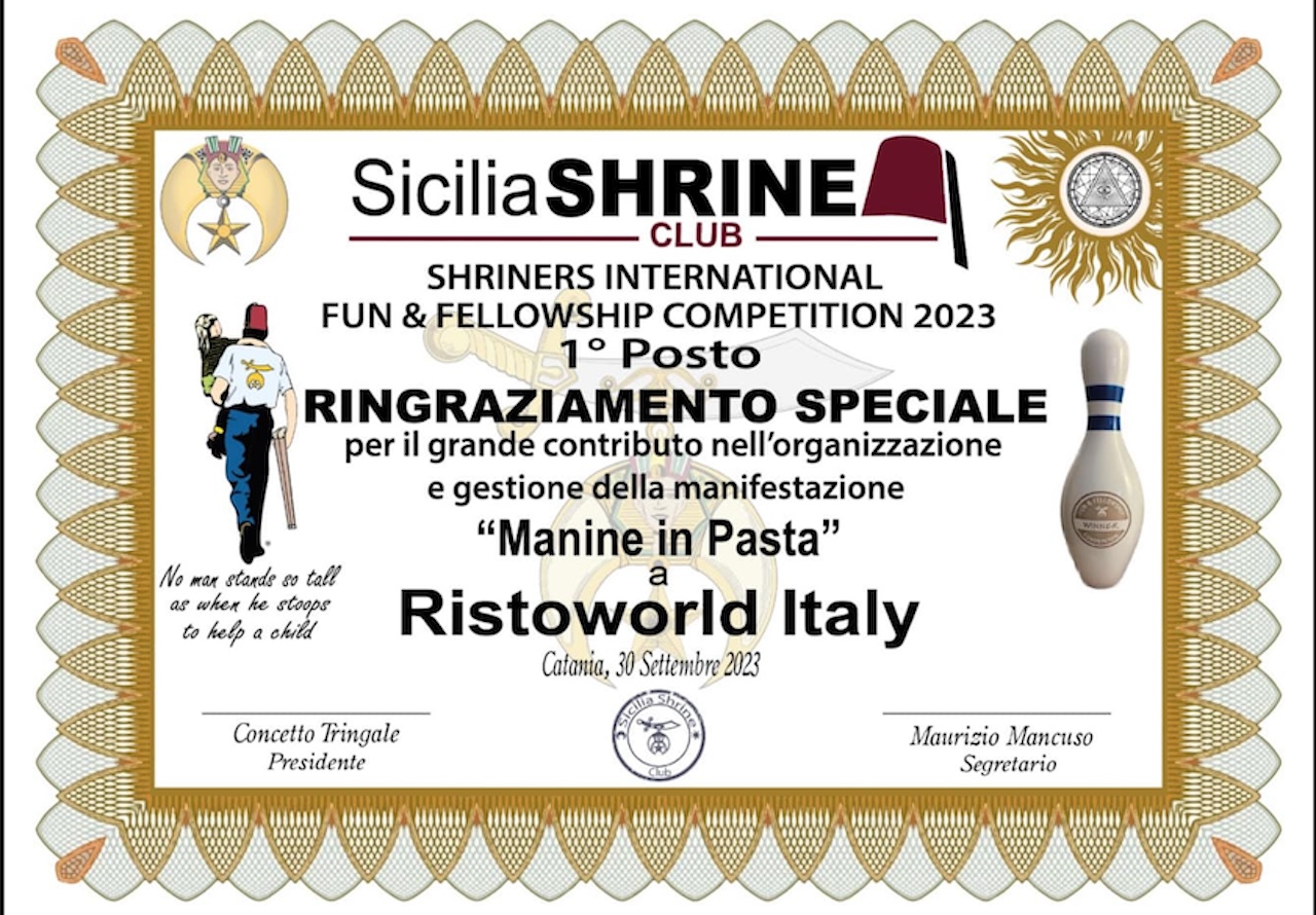 CATANIA – Le sale nobili di Palazzo Manganelli a Catania hanno ospitato l’assemblea ordinaria del Sicilia Shrine Club, Emirat Shriners, con premiazione di Ristoworld Italy per la fattiva collaborazione durante l’evento “Manine in pasta” che ha vinto il primo posto a livello mondiale del “Fun and fellowship competition” di Shriners Internatio