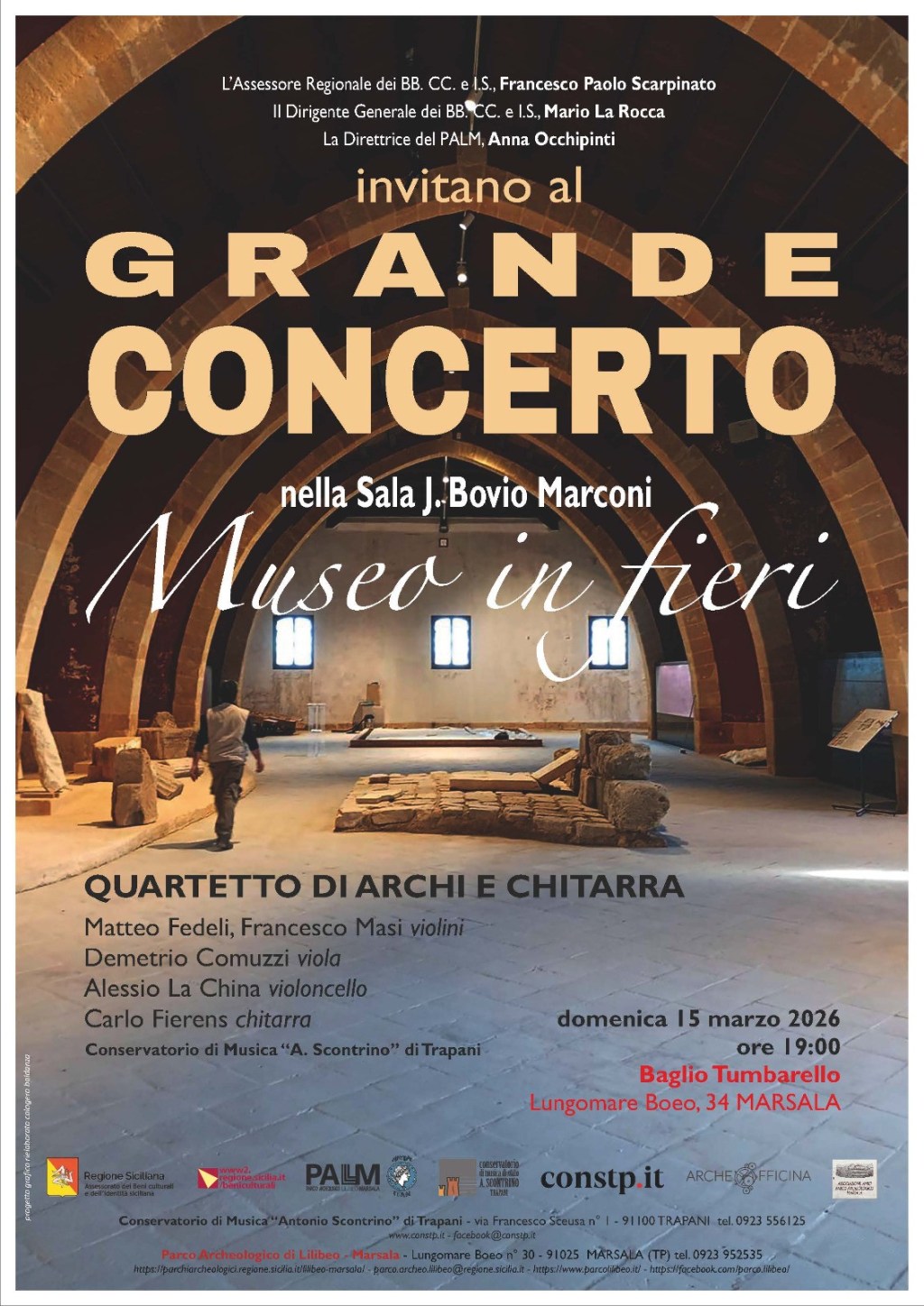 Domenica 15 marzo, alle ore 19.00, nella Sala ‘Jole Bovio Marconi’ del Baglio Tumbarello, si terrà un ‘grande’ concerto per quartetto di archi e chitarra. I maestri del Conservatorio di Stato ‘A. Scontrino’ di Trapani, Matteo Fedeli e Francesco Masi (violini), Demetrio Comuzzi (viola), Carlo Fierens (chitarra) e il musicista Alessio La China (violoncello) eseguiranno l’Op. 143 di Mario Castelnuovo Tedesco (1895-1968) e l’Op. G 453 di Luigi Boccherini (1743-1805).