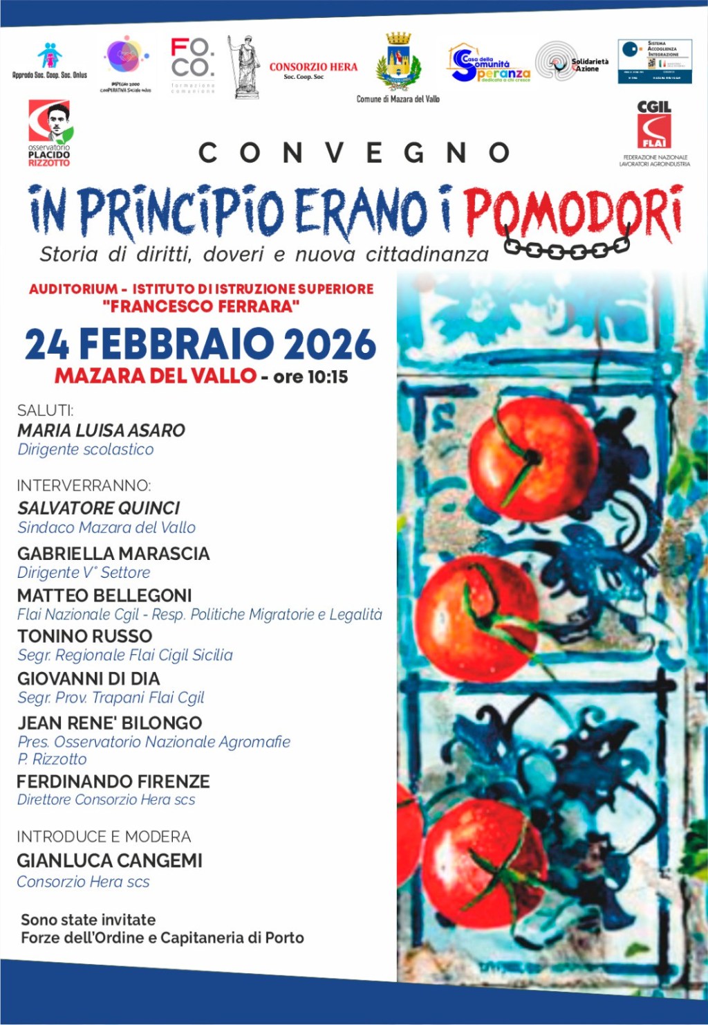 Giorno 24 febbraio si terrà a Mazara del Vallo presso l’auditorium dell’IIS “Francesco Ferrara” alle ore 10.15 l’evento “In principio erano i pomodori. Storia di diritti, doveri e nuova cittadinanza”. L’iniziativa è promossa da: Amministrazione comunale di Mazara del Vallo, Consorzio Hera Scs, IIS “F. Ferrara”, Solidarietà e azione, Casa della Comunità Speranza, Approdo Scs Onlus, FO.CO. Onlus, Impegno 2000 Soc Coop.