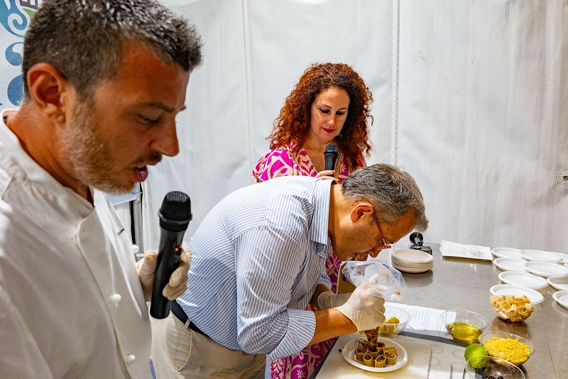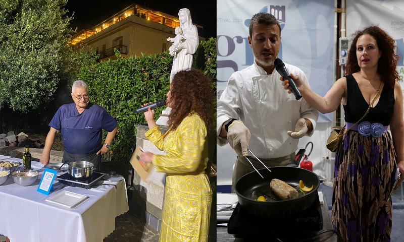 A seguire della rievocazione del 28, c’è stata una serie di interviste ai protagonisti dell’evento, come da consuetudine nel format “Borghi e Monti d’aMare Festival 2025”, su quali strategie siano state messe in campo con il Gal Tirrenico per potenziare le qualità preesistenti del territorio, con il padrone di casa Pietrafitta, il direttore Sauerborn, lo storico del paese Giovanni Conti, i due assessori con delega all’Agricoltura Giuseppe Coppolino e alle Attività Produttive Antonino Mandanici, i produttori di vino e olio – i fratelli Giovanni e Alessandro Salvo dei Principi di Mola e dell’Azienda Agricola Salvo Giovanni. Il Villaggio Enogastronomico del Gal Tirrenico, presente in ogni meta del tour, è stato allestito in Piazza Umberto I°. L’omaggio culinario all’area mazzarese non può mancare attraverso l’arte dal vivo dello chef Tindaro Ricciardo, con l’incarico di accompagnare le tappe con i loro ingredienti distintivi: in questo caso, è stato preparato un piatto con un tripudio di agrumi un ovvero maialino marinato con agrumi con tecnica sottovuoto a bassa temperatura con aromi vari e un pre -dessert a base di yogurt e Kumquat. Anche il sindaco Pietrafitta è stato coinvolto nel procedimento di preparazione del pre – dessert. Mentre, per esempio, per la tappa del 27 agosto a Rodì Milici (terra anche di buon olio e buon vino), amministrata dal sindaco Eugenio Aliberti, appassionato di cucina, si è pensato ai Grani Antichi Siciliani arricchiti dall’olio Evo e un formaggio di zona. Aliberti si è divertito nella partecipazione del Cooking Show, grazie alla farcitura del primo piatto.