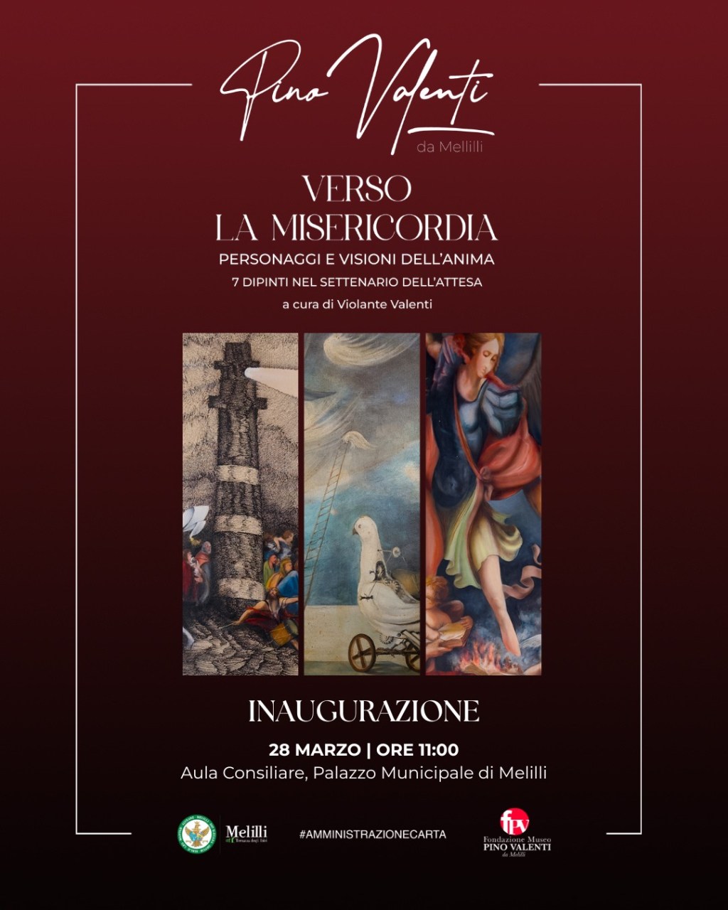La Fondazione Museo Pino Valenti da Melilli, in collaborazione con il Comune di Melilli, inaugura la mostra “Verso la Misericordia. Personaggi e visioni dell’anima”. L’evento si terrà sabato 28 marzo 2026 alle ore 11:00 presso l’Aula Consiliare del Palazzo Municipale di Melilli. L’ingresso è libero e aperto alla cittadinanza.