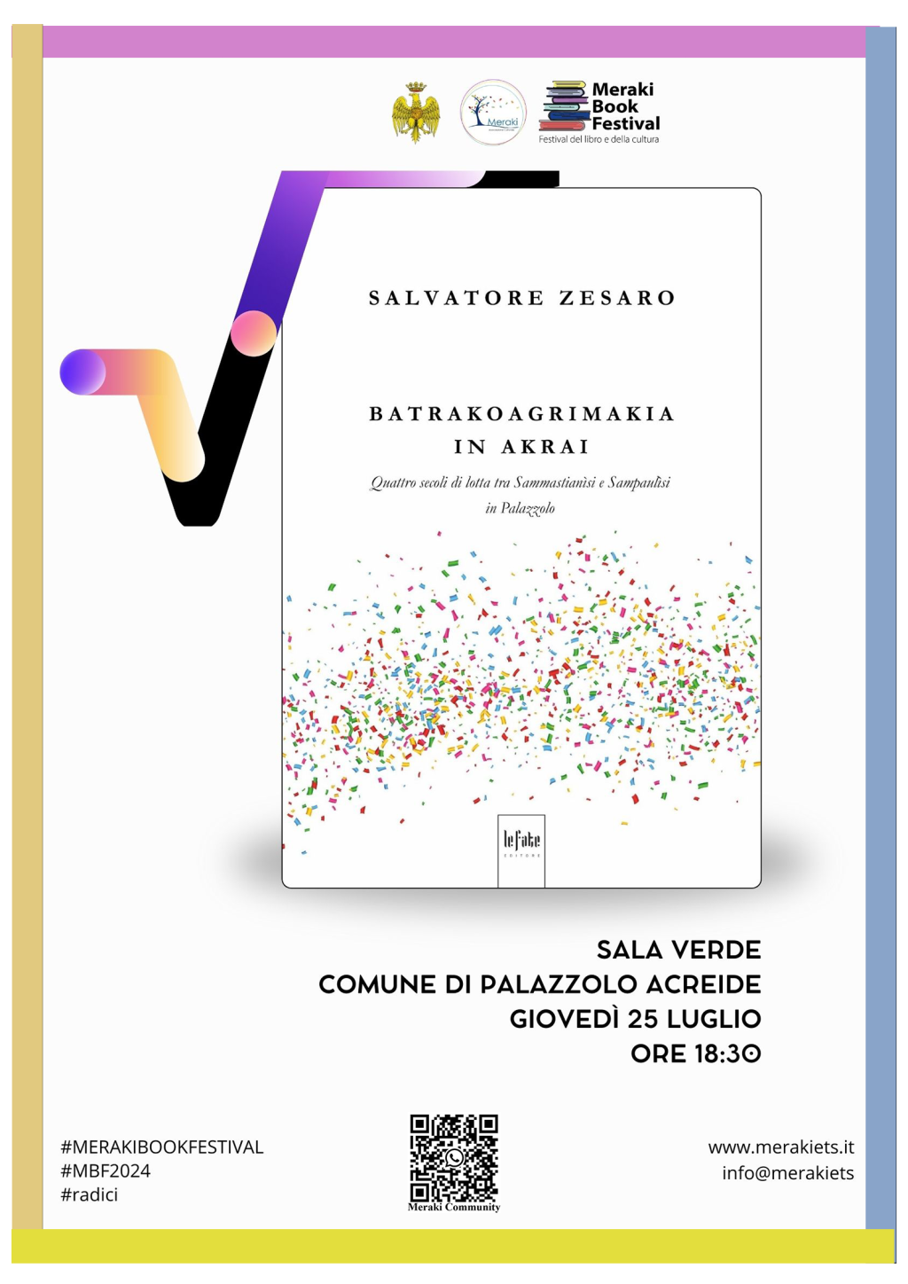 L’evento è una delle anteprime previste per la terza edizione del Meraki Book Festival – Festival del libro e della cultura, ideato, organizzato e promosso dall’associazione Meraki e in programma dal 6 all’8 settembre 2024, il cui tema sarà quello delle Radici.