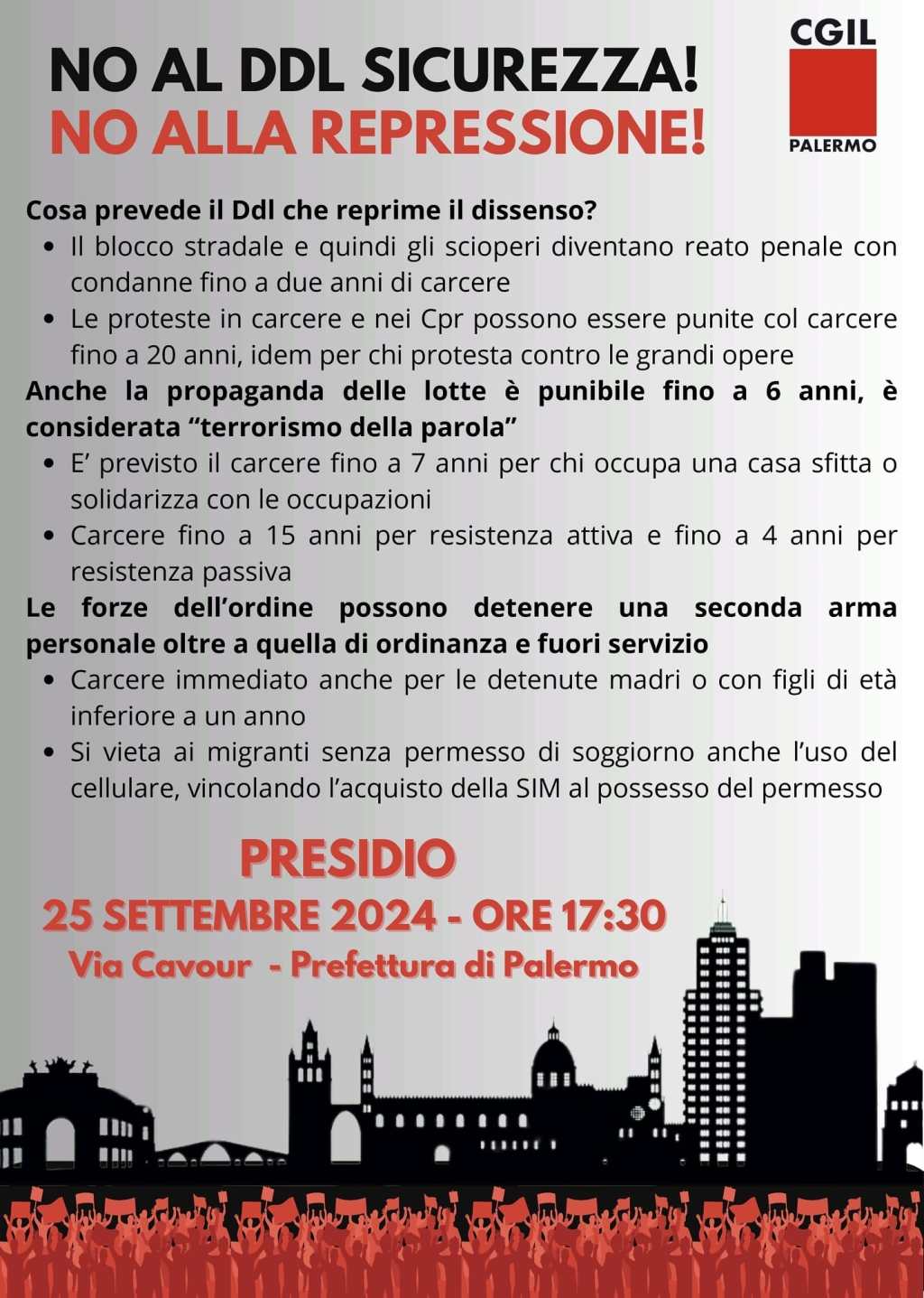 Palermo 23 settembre 2024 – La Cgil Palermo ha indetto per mercoledì 25, a partire dalle ore 17,30 un presidio davanti alla Prefettura, in nvia Cavour, contro il disegno di legge “sicurezza” già approvato alla Camera, in coincidenza dell’avvio della discussione in Senato.