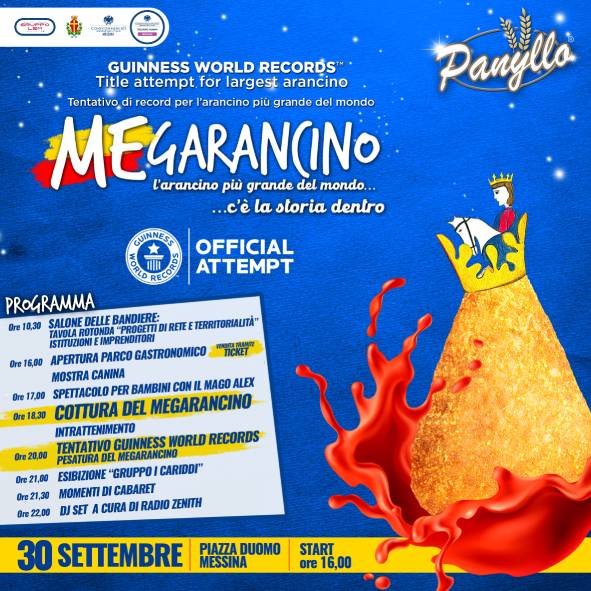 A Messina si sta per raggiungere un nuovo primato mondiale! Sta per arrivare, infatti, l’arancino più grande del mondo, creato da Stefano e Davide Ferro del Panificio, Rosticceria e Pizzeria Panyllo, con il supporto di Confcommercio Messina e il Gruppo Terziario Donna Confcommercio Messina e con il sostegno del Comune di Messina.