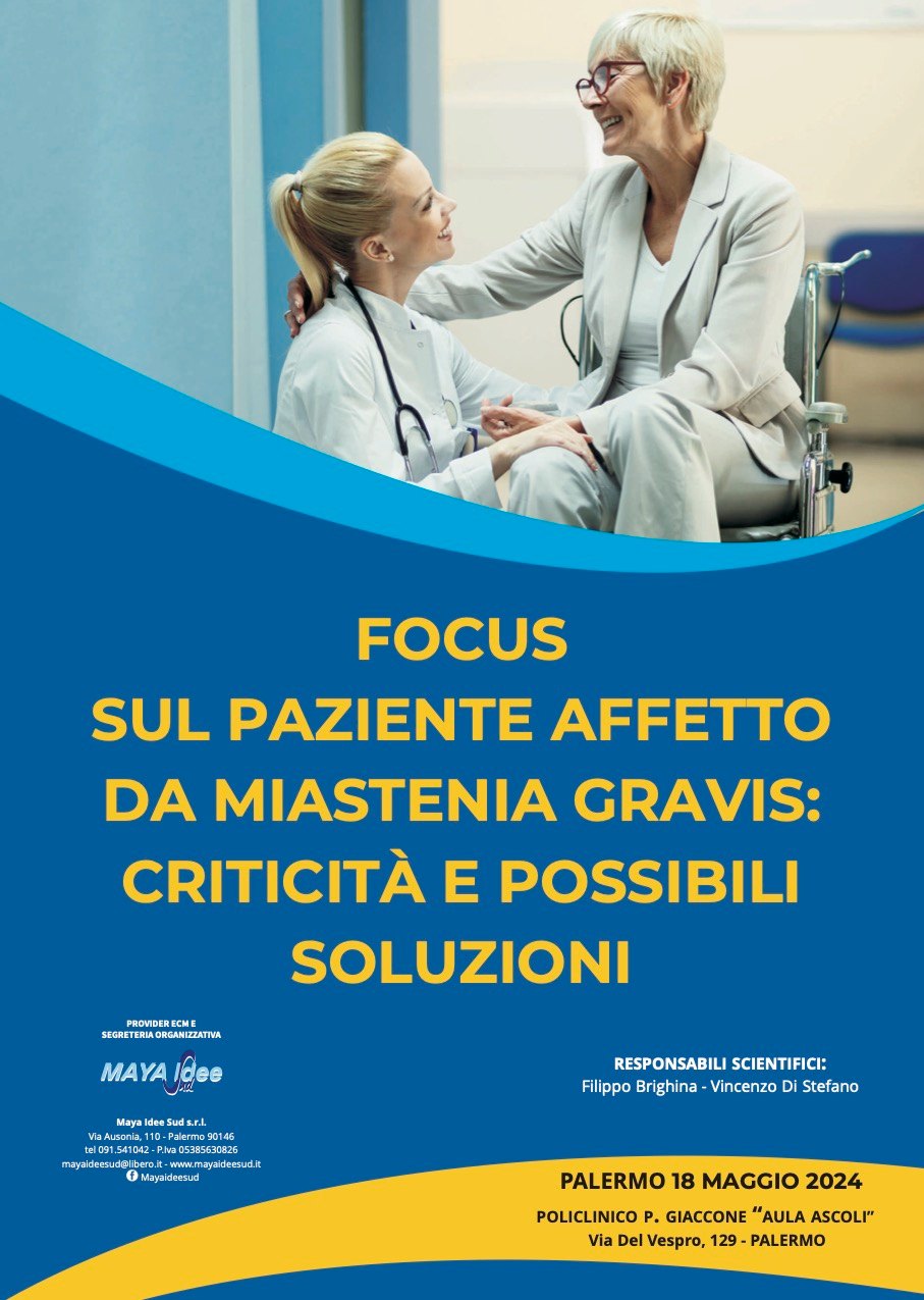 Focus sul paziente affetto da “Miastenia Gravis: criticità e possibili soluzioni”: è il titolo dell’importante evento che si terrà sabato 18 maggio, dalle 9:15 alle 14:00 , nella storica aula “Maurizio Ascoli” del Policlinico “Paolo Giaccone” di Palermo. La giornata è destinata ai pazienti, caregiver, specialisti e operatori sanitari coinvolti nella gestione della Miastenia Gravis e si pone come obiettivo un confronto tra pazienti miastenici, caregiver e tutte figure coinvolte socio sanitarie e assistenziali, nella gestione di tale malattia rara.