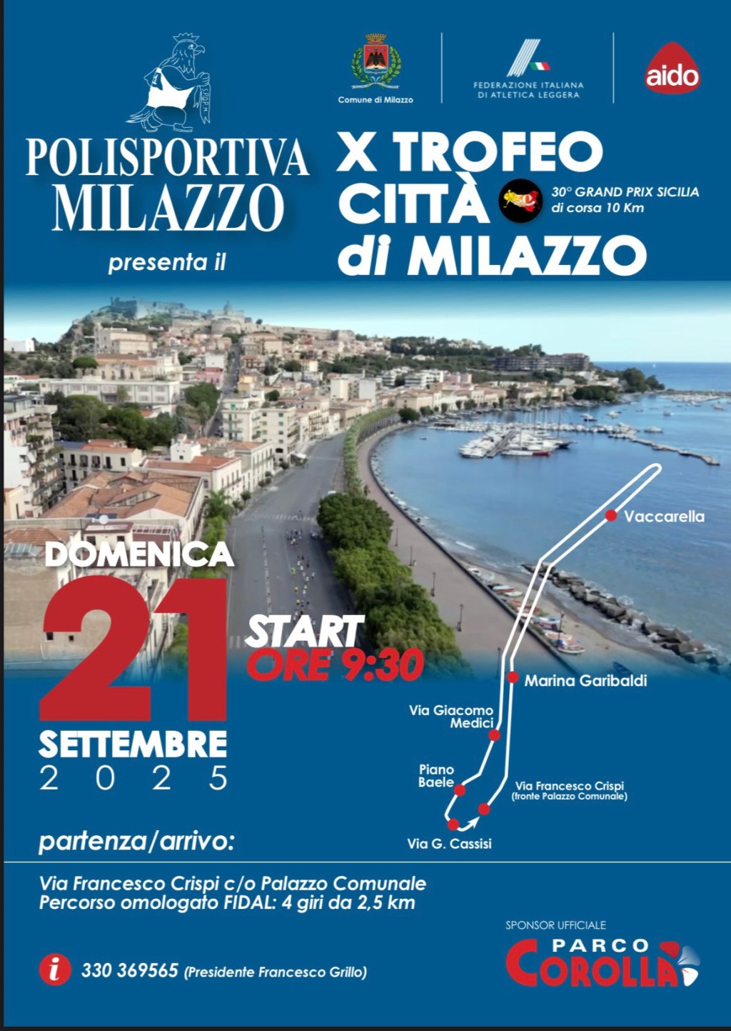 Dopo la pausa estiva si apre la seconda fase autunnale del 30º GP Regionale di corsa su strada di 10Km, per completare le 14 prove in programma. e l’assegnazione dei titoli regionali 2025 Tra i più importanti appunti in Sicilia , sicuramente figura il X° Trofeo Città di Milazzo, in programma domenica 21 /9/2025, una classica cittadina particolarmente attesa dai podisti , sopratutto quelli della Sicilia Orientale