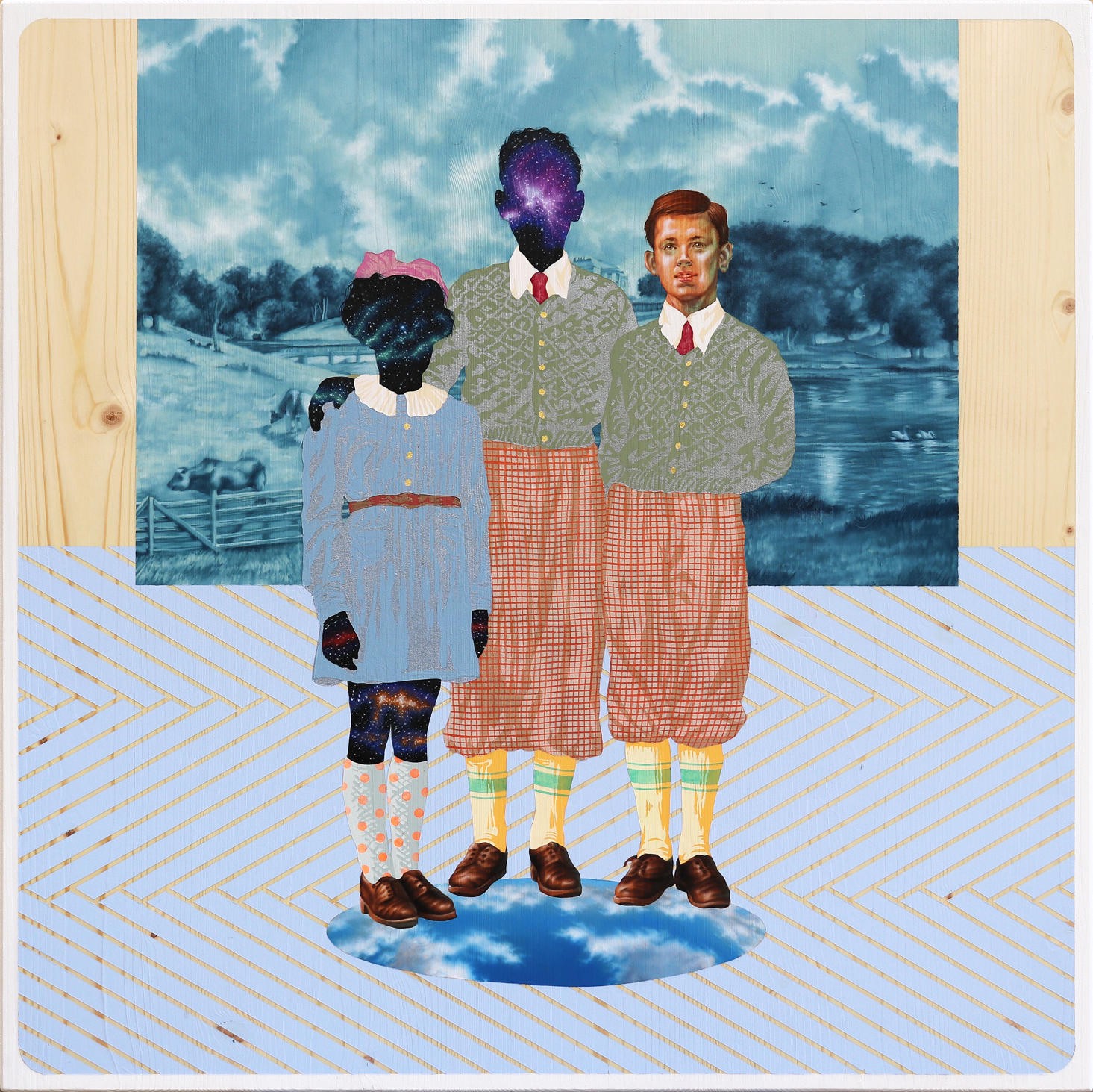 Se Costa lavora per sottrazione, Rastelli costruisce immagini in cui la figura umana è centrale. I suoi personaggi si stagliano su paesaggi-scenografia attraversati da pattern decorativi e suggestioni “pop”, trasformando il fondale in dispositivo narrativo attivo. La sua ricerca indaga il rapporto tra memoria, tempo e rappresentazione: fotografie d’epoca e immagini d’archivio vengono rielaborate in contesti sospesi tra realtà e immaginazione. Elementi come galassie e costellazioni emergono come proiezioni della psiche, mentre l’uso del legno di abete, con le sue venature, entra nella costruzione visiva dell’opera contribuendo al significato formale e narrativo.