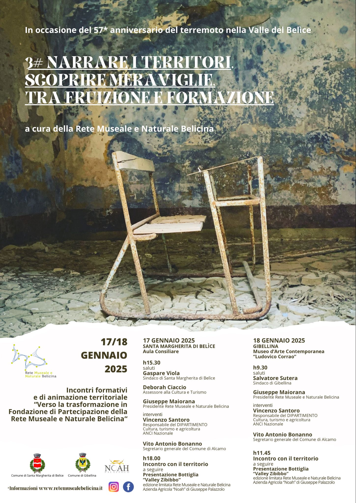 “Verso la trasformazione in Fondazione di Partecipazione della Rete Museale e Naturale Belicina”, è invece il tema su cui si svolgeranno, sempre nell’ambito dell’iniziativa “Narrare territori. Scoprire meraviglie tra fruizione e formazione”, i due incontri in programma. Il 17 gennaio, a Santa Margherita di Belice, alle 15.30 nell’aula consiliare, dopo i saluti del sindaco Gaspare Viola, dell’assessore comunale a Cultura e Turismo, Deborah Ciaccio, e di Giuseppe Maiorana, presidente della Rete Museale e Naturale Belicina, ci saranno gli interventi di Vincenzo Santoro, responsabile del Dipartimento Cultura, Turismo e Agricoltura – ANCI Nazionale, e Vito Antonio Bonanno, segretario generale del Comune di Alcamo. L’indomani, 18 gennaio, al Mac – Museo d’Arte contemporanea di Gibellina, alle 9.30, dopo i saluti del sindaco Salvatore Sutera, e di Giuseppe Maiorana, presidente della Rete Museale e Naturale Belicina, sono previsti gli interventi di Vincenzo Santoro, responsabile del Dipartimento Cultura, Turismo e Agricoltura – ANCI Nazionale, e di Vito Antonio Bonanno, segretario generale del Comune di Alcamo.