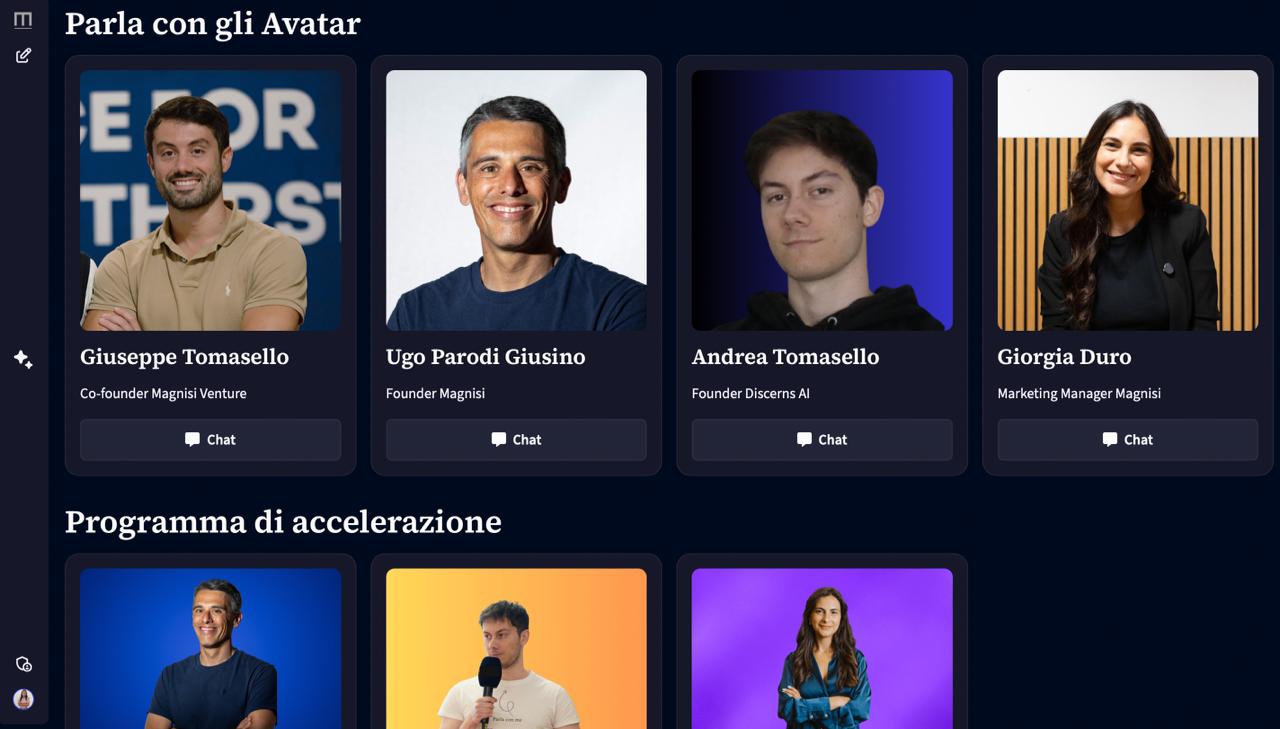 Basata su algoritmi avanzati di Intelligenza Artificiale e su cloni digitali addestrati su competenze verticali, Magnisi AI offre tramite un team virtuale un accesso immediato e continuativo, 24 ore su 24, a un patrimonio di competenze strategiche, spesso irraggiungibili per le realtà imprenditoriali in fase early stage.