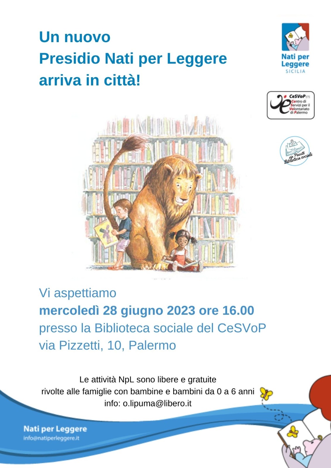 Mercoledì 28 giugno è in programma l’inaugurazione di un nuovo presidio Natiper Leggere, un evento che il CeSVoP accoglie a Palermo nei locali della Biblioteca sociale di via Pizzetti, 10, il bene confiscato alla mafia e assegnato al CeSVoP per la realizzazione di progetti di promozione della cultura della solidarietà in collaborazione con gli ETS. Durante il pomeriggio sono previste presentazioni, letture per i piú piccini, merenda. Un momento di festa per il territorio. Ingresso gratuito.