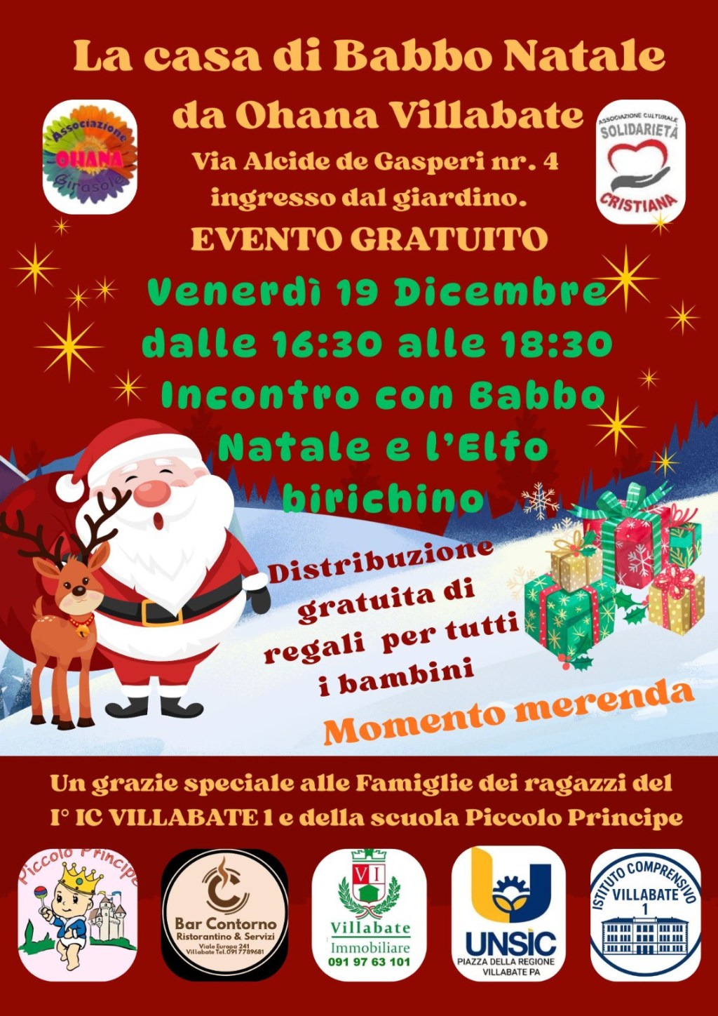 Quest’anno Babbo Natale distribuirà gratuitamente i giocattoli a tutti i Bambini, grazie alla collaborazione tra l’Associazione Solidarietà Cristiana, Ohana Villabate e Associazione Pomara Duemilauno, Caritas Parrocchiale Parrocchia Sant’Agata Villabate.