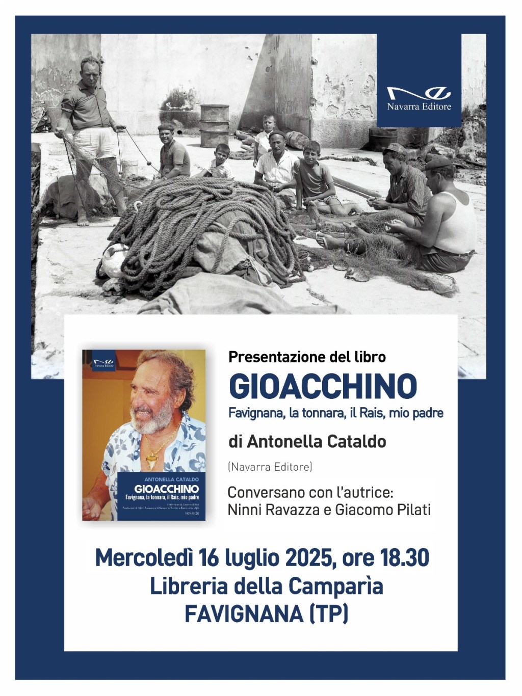 Navarra Editore è lieta di annunciare la prima presentazione ufficiale del nuovo libro di Antonella Cataldo, Gioacchino. Favignana, la tonnara, il Rais, mio padre, dedicato a una delle figure più emblematiche dell’isola: Gioacchino Cataldo, celebre Rais di Favignana.