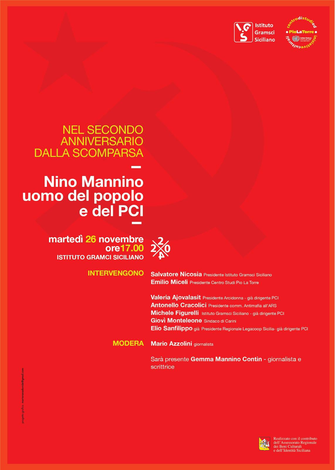 A due anni dalla sua scomparsa, Nino Mannino sarà ricordato alle 17 di martedì 26 Novembre nella sala dibattiti dell’Istituto Gramsci Siciliano, ai Cantieri Culturali alla Zisa. Promosso da chi ospita l’evento e dal Centro Studi Pio La Torre, il pomeriggio sarà animato da diverse testimonianze, ognuna delle quali comporrà il mosaico di una vita ricchissima non solo dal punto di vista politico, ma anche profondamente umano.