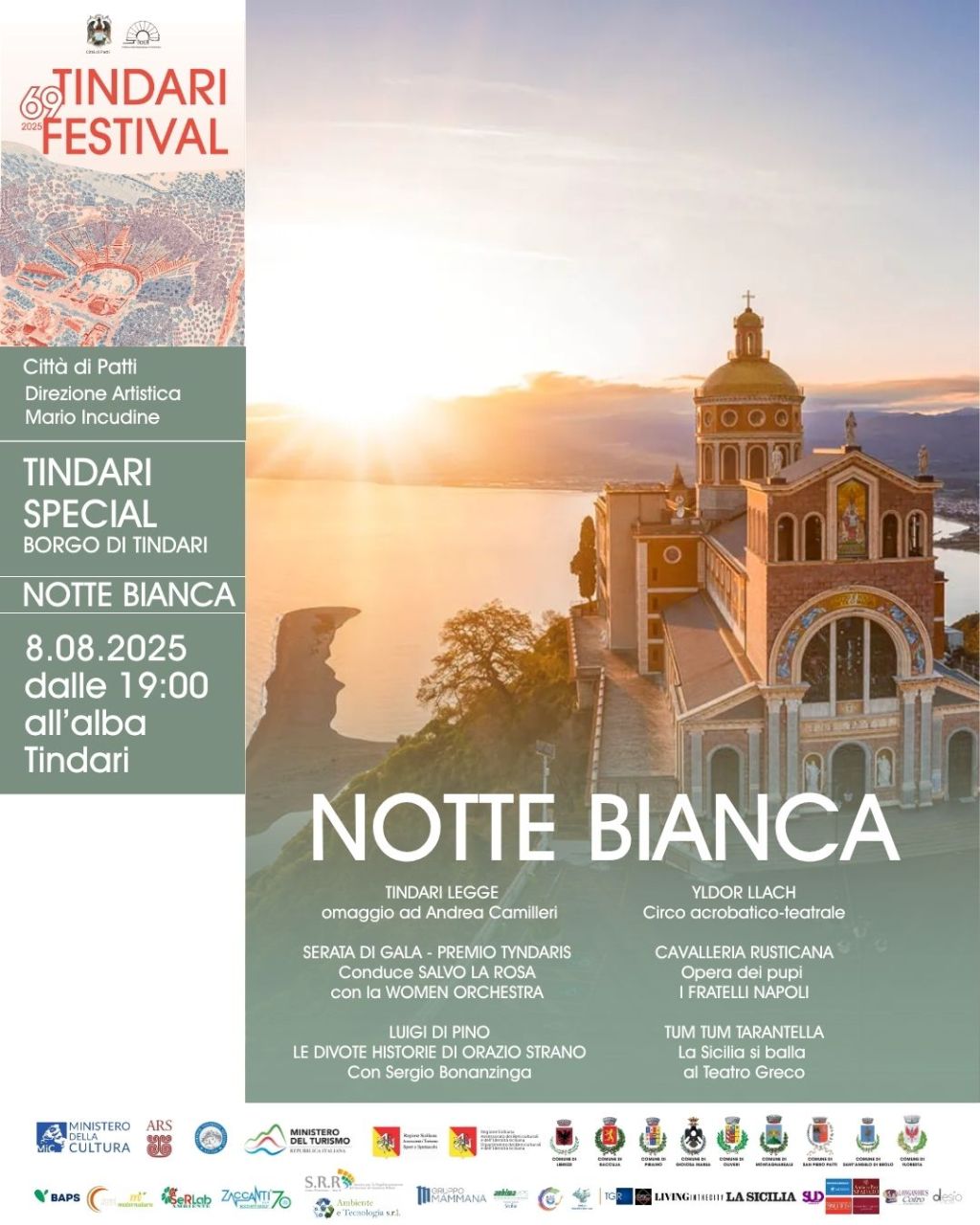 Si tratta della Notte Bianca, che dalle ore 19 di venerdì 8 agosto fino alle ore 5 di mattina del giorno dopo, vedrà lo splendido borgo di Tindari trasformarsi in un palcoscenico a cielo aperto, con appuntamenti di ogni genere.