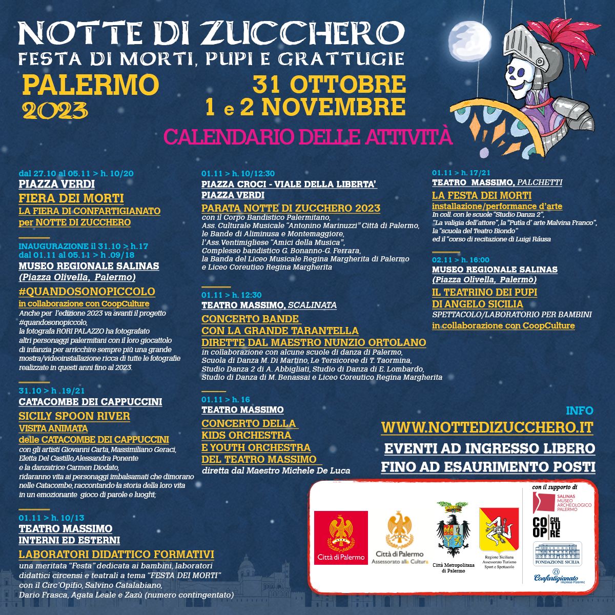 Ad animare Notte di Zucchero ci saranno anche alcuni appuntamenti che vedranno protagonista il Teatro Massimo: il primo novembre, a partire dalle 10 e fino alle 13, infatti, l’Istituzione culturale cittadina per eccellenza diventa luogo d’incontro per laboratori didattico-formativi dedicati ai più piccoli, condotti da Agata Leale, Circ’Opificio, Salvino Catalabiano, Dario Frasca e Zazù. I bambini potranno inoltre farsi truccare grazie alla presenza degli allievi della scuola di trucco Esfo.