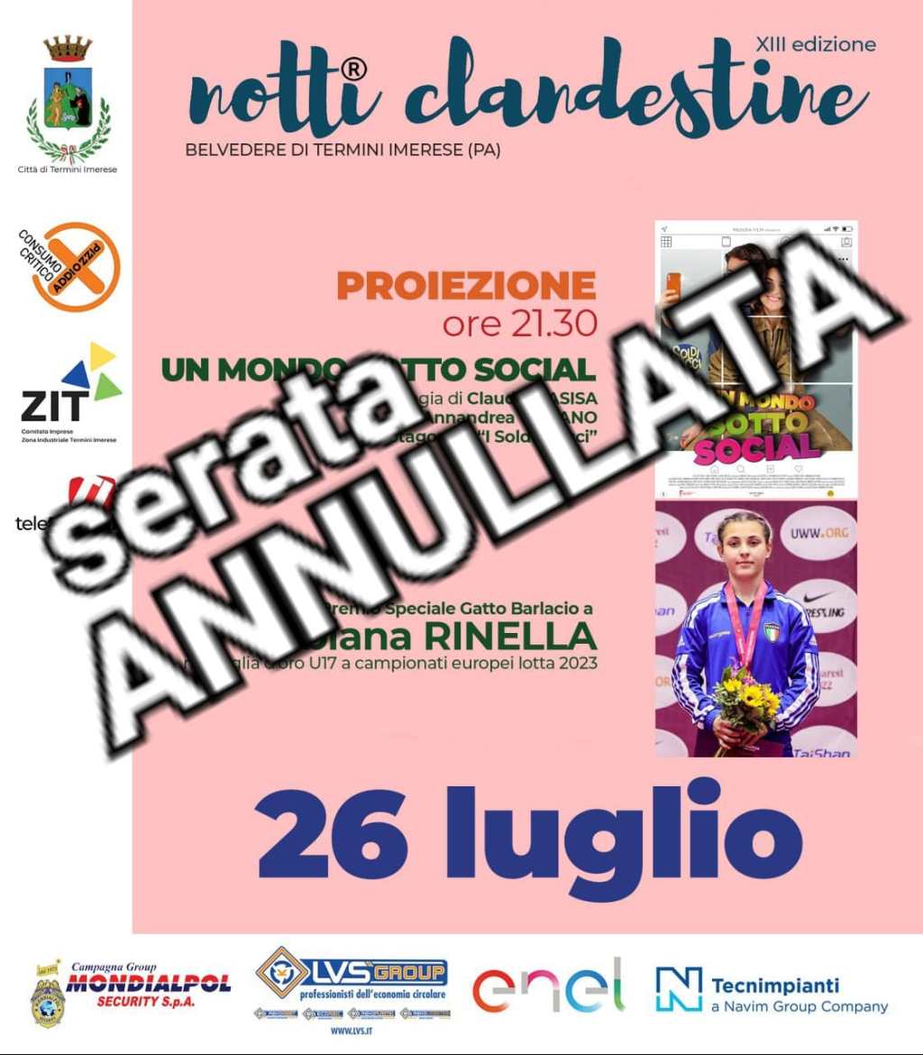 “Siamo costernati nel dover annunciare che siamo costretti ad annullare la serata in programma questa sera per il forte vento di maestrale che rende impossibile la proiezione”, dichiarano gli organizzatori. Gli appuntamenti in programma riprenderanno regolarmente domani 27 luglio. La premiazione della campionessa Fabiana Rinella si svolgerà nella serata di venerdì 28 luglio.
