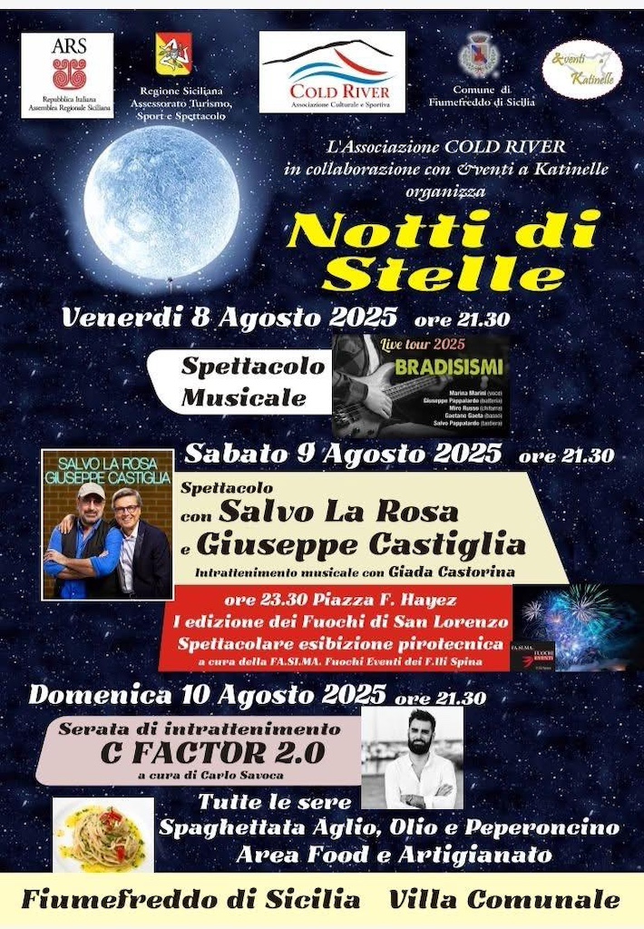 Ogni serata sarà arricchita dalla tradizionale spaghettata aglio, olio e peperoncino, oltre alla presenza di stand gastronomici e artigianato locale, per un’atmosfera festosa e conviviale che abbraccia tutta la comunità. L’ingresso è libero e aperto a tutti. “La nostra associazione, sempre attenta alle dinamiche sociali del nostro paese, mette grande impegno e sacrificio nell’organizzazione di eventi come questo – spiegano il presidente e il vicepresidente dell’associazione Cold River, Cesare Cavallaro e Massimo Caramma – Lo facciamo con passione, nella consapevolezza che offrire spazi di incontro, svago e condivisione sia un modo concreto per contribuire al benessere collettivo e al rafforzamento del tessuto sociale. ‘Notti di Stelle’ è per noi un atto d’amore verso la nostra comunità, una festa popolare pensata per unire e far brillare Fiumefreddo”.