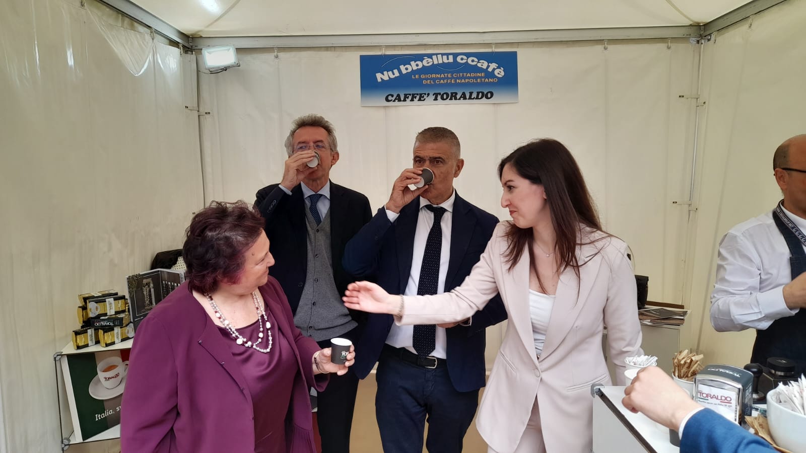 Al taglio del nastro la Vicepresidente del Consiglio Comunale di Napoli Flavia Sorrentino, anima e madrina dell’iniziativa insieme all’Assessora al Turismo Teresa Armato, nonché prima firmataria dell’approvazione dell’ordine del giorno all’unanimità sull’istituzione della giornata cittadina del caffè a Napoli; insieme a lei l’ex Ministro dell’Ambiente e delle Politiche Agricole e Forestali Alfonso Pecoraro Scanio, presidente della Fondazione UniVerde.