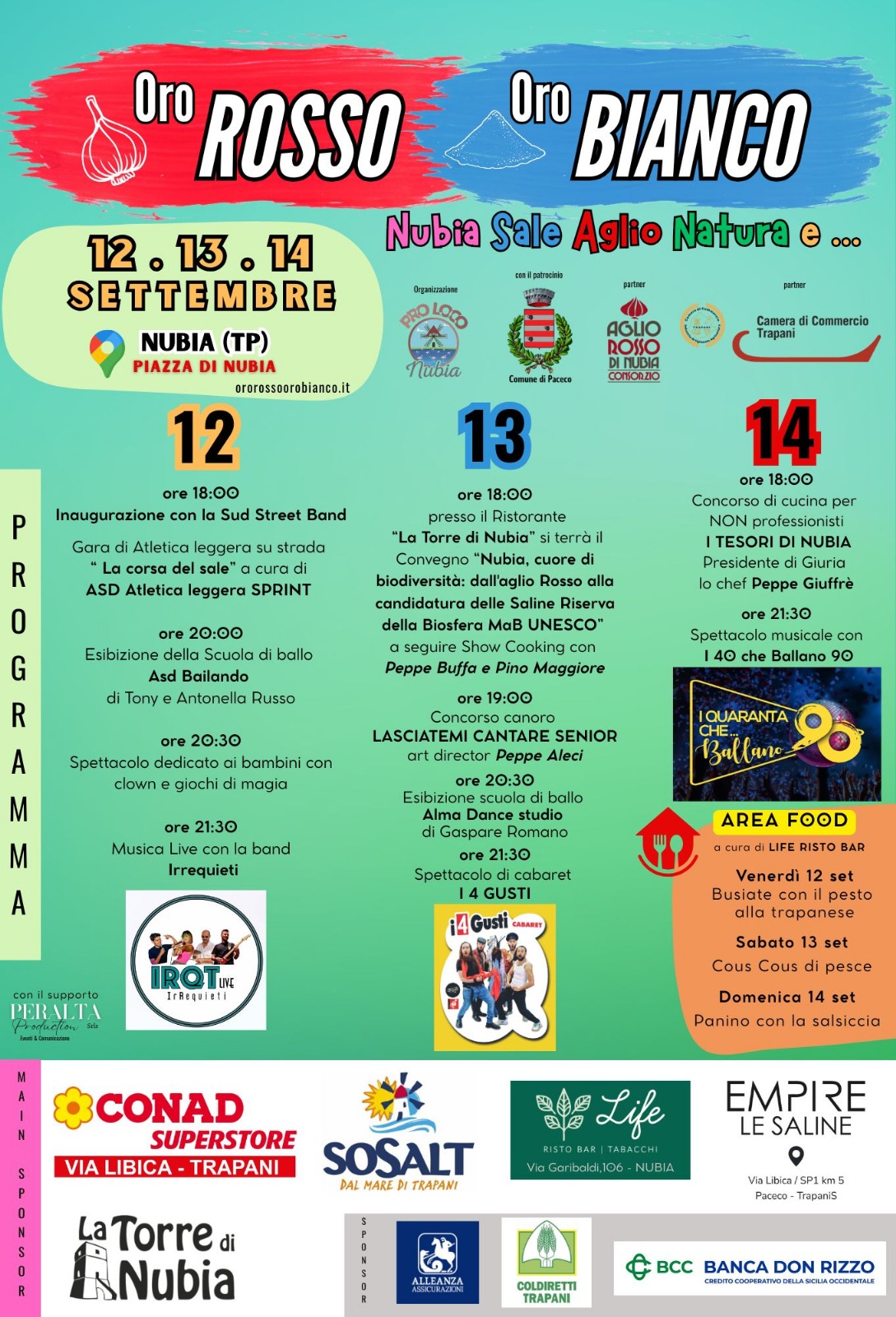 Il borgo di Nubia, nel cuore del Comune di Paceco, si prepara a vivere tre giornate di festa e cultura con “Oro Rosso, Oro Bianco”, la manifestazione organizzata dalla Pro Loco di Nubia APS con il patrocinio del Comune di Paceco, della Camera di Commercio di Trapani, del Consorzio di Tutela dell’Aglio Rosso di Nubia e con il supporto della Peralta Production.