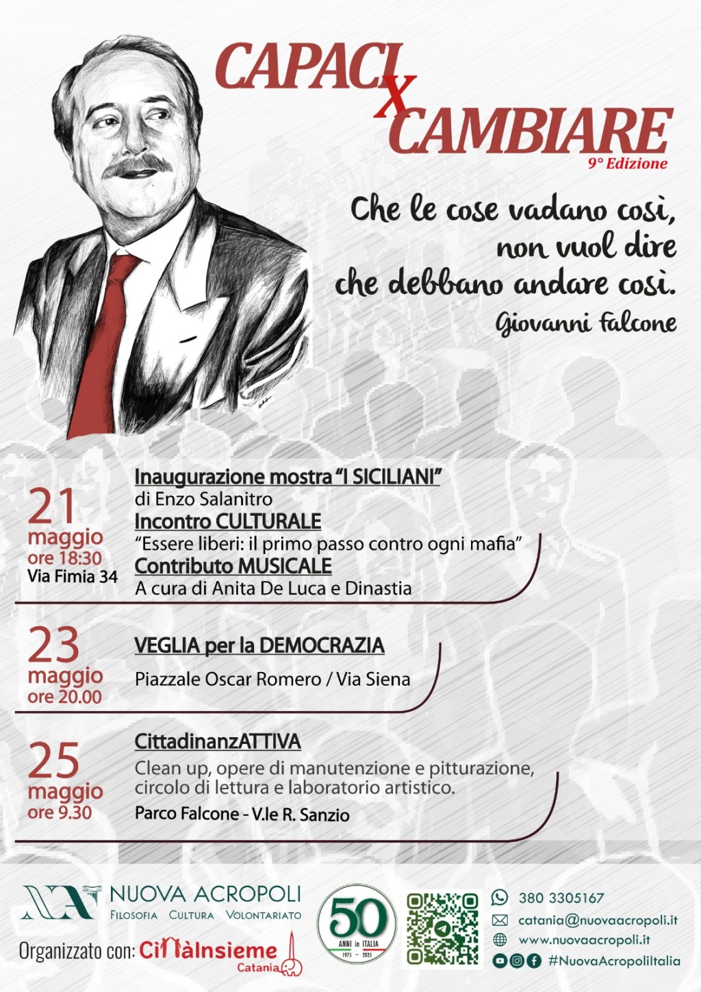 Per la nona edizione di “CapaciXCambiare” Nuova Acropoli ha organizzato degli appuntamenti ricchi e poliedrici, per ricordare la strage e i volti delle vittime della mafia con il pensiero e l’azione. Il progetto è nato proprio nove anni fa, dalla collaborazione e sinergia di Nuova Acropoli e CittàInsieme, per dare nuove forme al volto della commemorazione. La necessità è non solo riportare alla memoria, ma essere seme di un cambiamento profondo che può – e deve – partire da ognuno di noi.