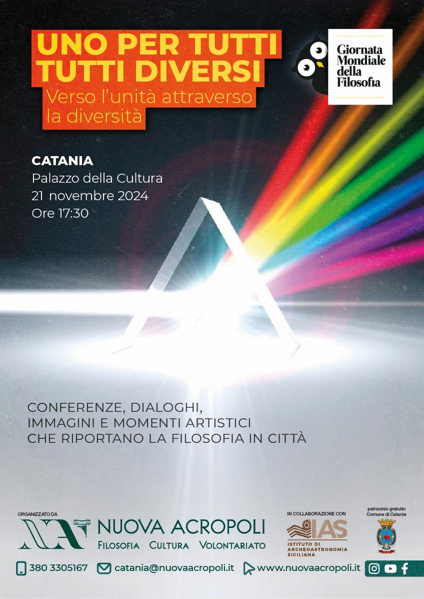 Nuova Acropoli celebra la 18ª edizione della Giornata Mondiale della Filosofia, indetta dall’UNESCO. A Catania l’appuntamento sarà giovedì 21 novembre presso il Palazzo della Cultura alle ore 17:30 per l’evento “Uno per tutti, tutti diversi” che si propone di approfondire il tema “Verso l’Unità attraverso la diversità”, motto che guida le attività di Nuova Acropoli nel mondo nel 2024. Il pomeriggio inizierà con un video racconto delle edizioni passate e con la messa in scena di una visione filosofica intitolata “Essere uno essendo molteplici”, sull’unione necessaria nel destino dell’umanità. Cuore della serata la conferenza “Skyscape: Introduzione all’archeoastronomia” tenuta dall’astrofisico Andrea Orlando e le riflessioni filosofiche sul tema “Verso l’unità attraverso la diversità” a cura di Vincenzo Messina, presidente di Nuova Acropoli Catania. Vedremo come la diversità è bellezza e ricchezza – indispensabile nell’intento di stabilire l’unità con tutti gli uomini – attraverso un viaggio tra astronomia, archeologia e contesti storici e culturali. Rifletteremo su come la “scienza delle pietre e delle stelle” possa unire saperi e culture e su come l’uomo – attraverso il pensiero e le azioni – è sempre stato interessato a quest’opera di unificazione.