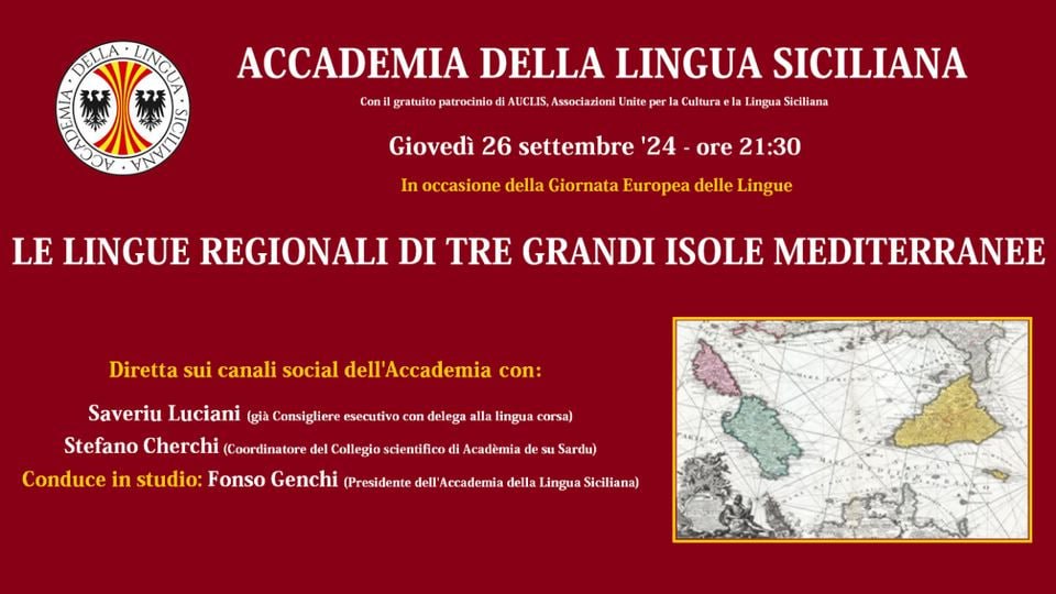 Tali lingue sono infatti parte del patrimonio culturale europeo la cui tutela e promozione contribuiscono alla costruzione di un’Europa basata sulla democrazia e sulla diversità culturale. In tutta Europa si celebrerà questa Giornata attraverso vari eventi. Per quanto riguarda la Sicilia, l’AUCLIS (Associazioni Unite per la Cultura e Lingua Siciliana) segnala un evento online che riguarda anche la lingua siciliana. L’evento, dal titolo “Le Lingue Regionali di tre grandi isole mediterranee”, avrà luogo nella serata del 26 (inizio ore 21,30). Fonso Genchi, Presidente dell’Accademia della Lingua Siciliana – che organizza l’evento col gratuito patrocinio dell’AUCLIS – dialogherà con Saveriu Luciani, ex Assessore del Governo Corso con delega alla lingua corsa, e con Stefano Cherchi, Coordinatore del Collegio Scientifico dell’Acadèmia de su Sardu, per scoprire e confrontare la situazione delle lingue corsa, sarda e siciliana. Sarà possibile assistere gratuitamente all’incontro online collegandosi al canale YouTube dell’Accademia della Lingua Siciliana.
