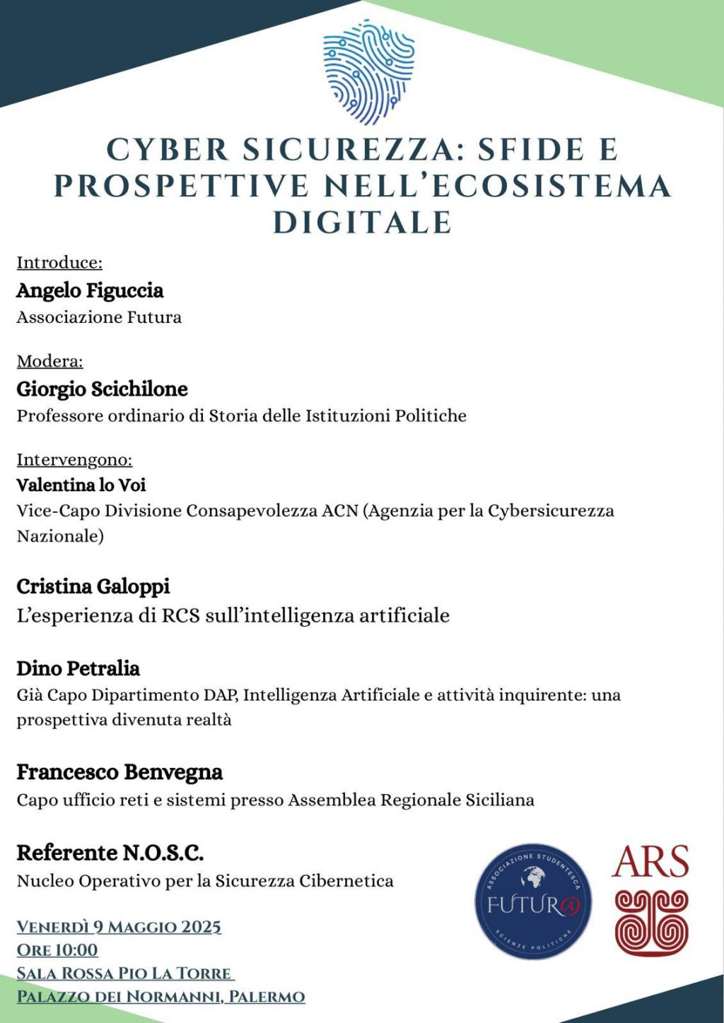 Al convegno interverranno insieme al curatore del convegno e responsabile dell’Associazione Futura Angelo Figuccia, Giorgio Scichilone Ordinario di Storia delle Istituzioni Politiche, Valentina Lo Voi Vice Capo divisione Consapevolezza ACN (Agenzia per la Cybersicurezza Nazionale), Cristina Galoppi RCS, Dino Petralia già Capo Dipartimento DAP, Intelligenza Artificiale e attività inquirente, Francesco Benvegna Capo Ufficio reti e sistemi presso l’Assemblea Regionale Siciliana ed in fine chiuderà i lavori il Referente N.O.S.C. (Nucleo Operativo per la sicurezza Cibernetica.)