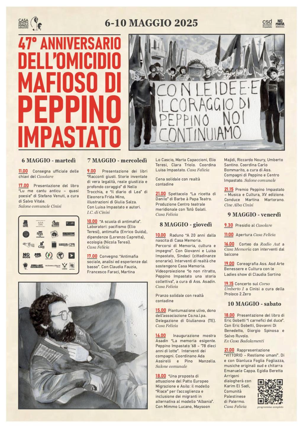 Il 9 maggio 2025 ricorre il 47º anniversario dell’omicidio di Peppino Impastato, assassinato dalla mafia nel 1978 a Cinisi (PA).