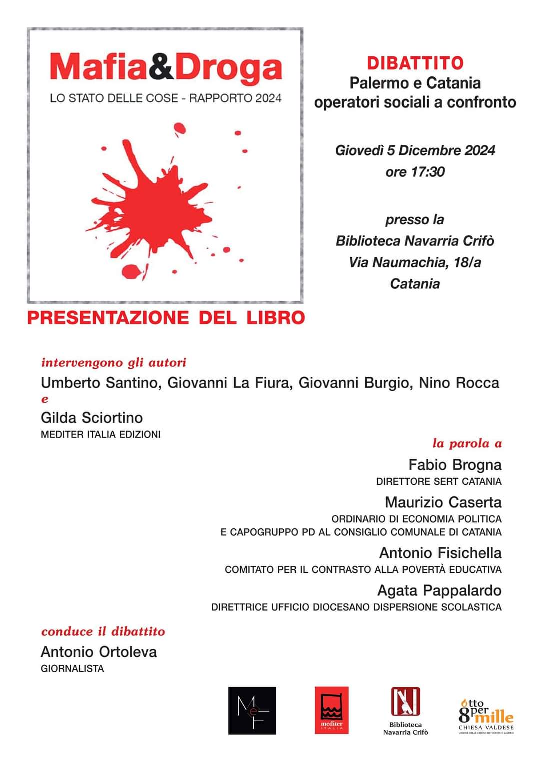 Al dibattito, interverranno: Fabio Brogna, direttore Sert Catania; Maurizio Caserta, professore ordinario di Economia Politica e capogruppo Pd al Consiglio Comunale di Catania; Antonio Fisichella, del Comitato per il contrasto alla povertà educativa; Agata Pappalardo, direttrice dell’Ufficio Diocesano sulla Dispersione scolastica.