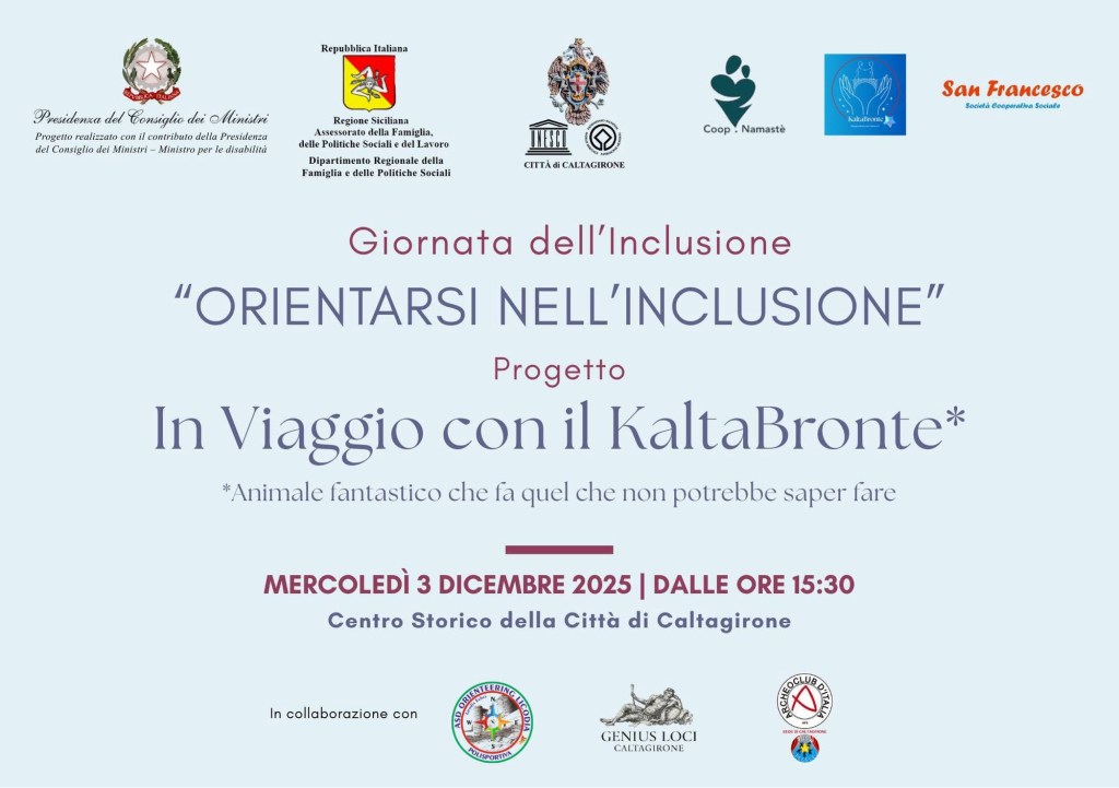 In occasione della Giornata Internazionale delle Persone con Disabilità, domani, 3 dicembre, alle ore 15:00, in Piazza Municipio a Caltagirone, nell’ambito delle manifestazioni “Natale a Caltagirone – Lumina 2025”, si svolgerà un’esperienza di Orienteering che vedrà protagonisti i partecipanti al progetto “In viaggio con il KaltaBronte”, animale fantastico che fa, comunque, quello che non saprebbe saper fare”, provenienti da Caltagirone e Bronte.