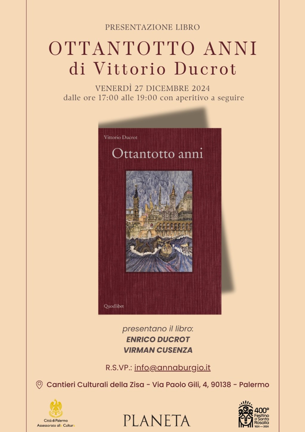 Nel corso della presentazione del 27 dicembre Enrico Ducrot dialogherà con Virman Cusenza, prestigiosa firma del giornalismo italiano, per raccontare gli Ottantotto anni attraverso ricordi di famiglia, aneddoti e curiosità della vita del celebre papà che ha sempre mantenuto un rapporto molto stretto con Palermo.