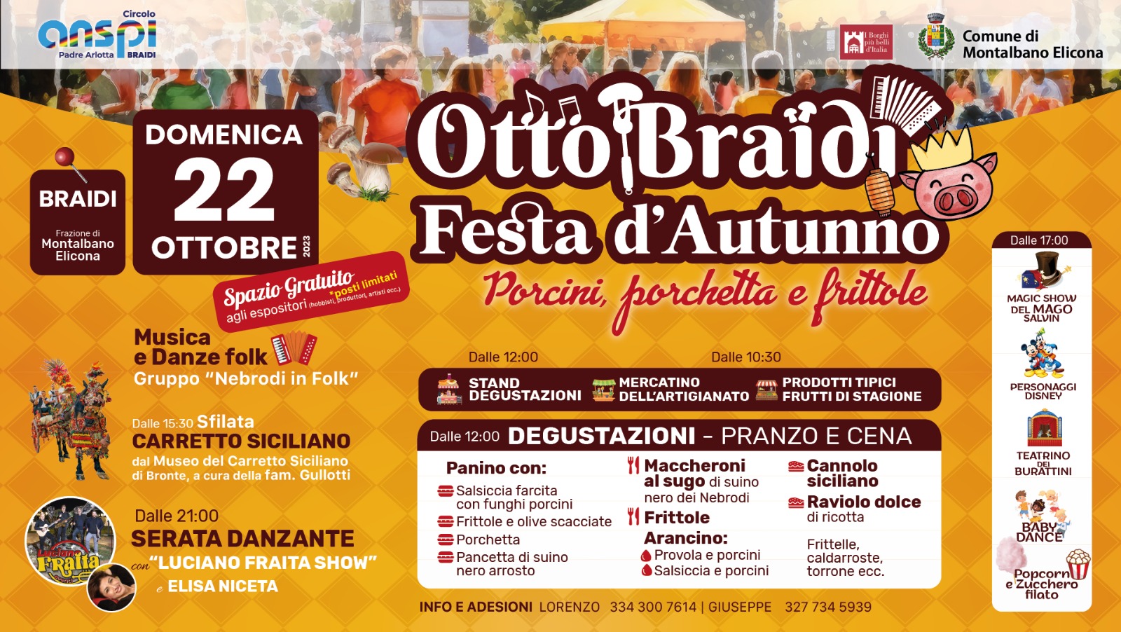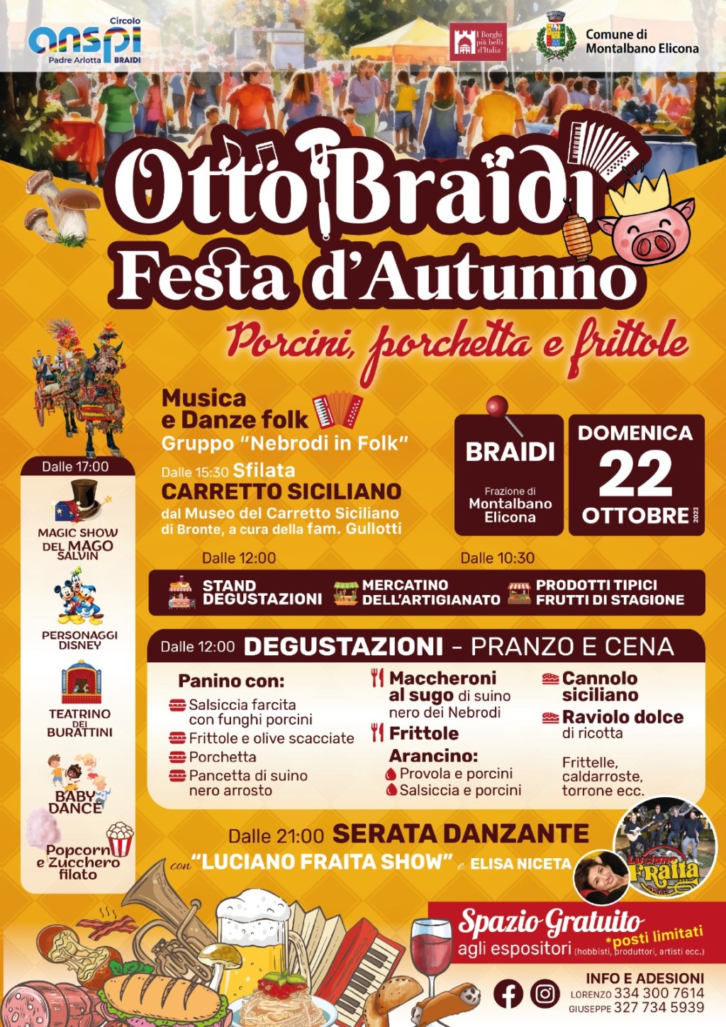 Al via la seconda edizione di “OttoBraidi, festa d’autunno”, la manifestazione organizzata dal Circolo Anspi “Padre Arlotta” in collaborazione con il comune di Montalbano Elicona, tra i borghi più belli d’Italia, che offre la possibilità di trascorrere una domenica all’insegna del gusto, della tradizione e dello svago.