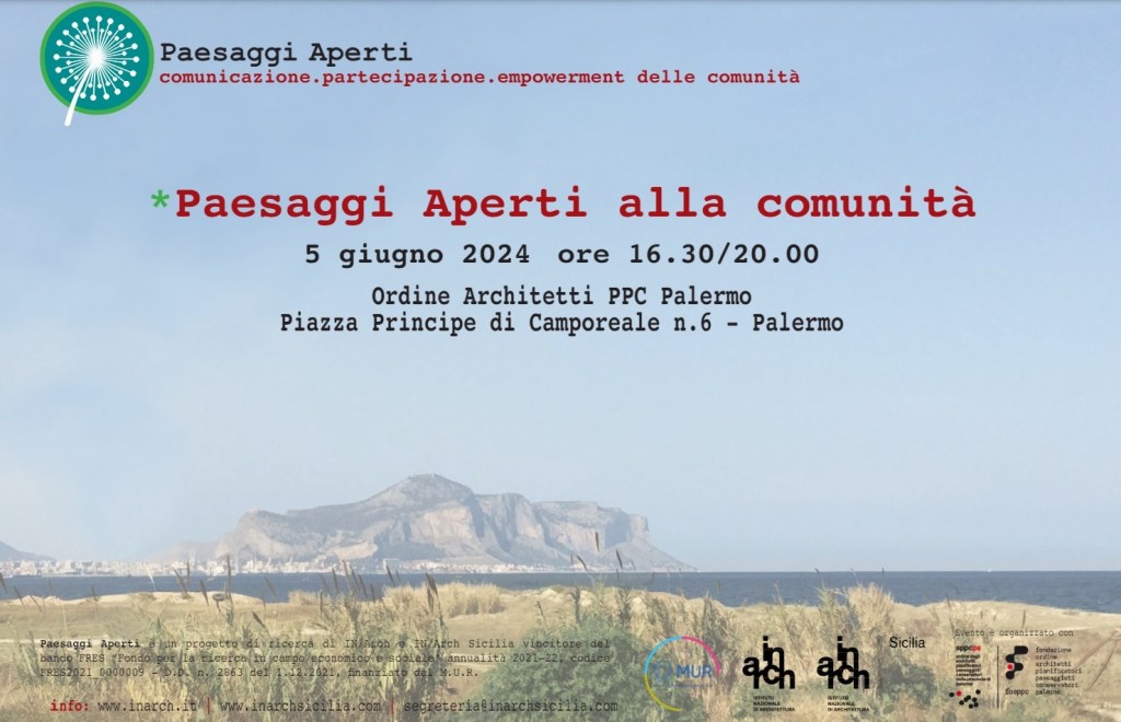 Il 5 giugno 2024 a Palermo dalle ore 17.00 alle 20.00, nella sede dell’Ordine degli Architetti PPC in piazza Principe di Camporeale 6, si terrà “Paesaggi aperti alla comunità”, un incontro pubblico dedicato al rapporto tra partecipazione e rigenerazione urbana che vuole coinvolgere cittadini e professionisti ed organizzato nell’ambito del progetto annuale “Paesaggi Aperti” promosso da IN/Arch e dalla sezione territoriale IN/Arch Sicilia e vincitore del bando FRES “Fondo per la ricerca in campo economico e sociale” annualità 2021-22, finanziato dal Ministero dell’Università e della Ricerca.