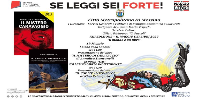 Doppio appuntamento in programma venerdì 19 maggio 2023 nel Salone degli Specchi di Palazzo dei Leoni, nell’ambito della XIII edizione del Il Maggio dei Libri 2023 – “Il mondo è un libro”, organizzata dalla I Direzione “Servizi Generali e Politiche di Sviluppo Economico e Culturale” Servizio “Cultura” Ufficio Biblioteca “Giovanni Pascoli” della Città Metropolitana di Messina.
