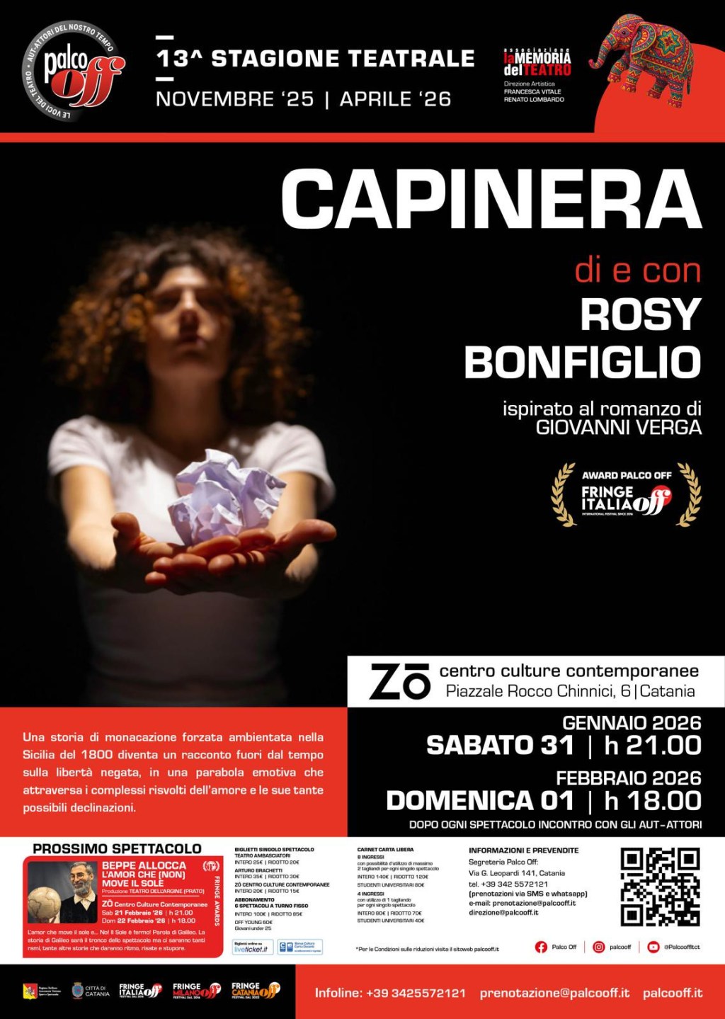 Dopo il successo in tutta Italia, “Capinera”, il toccante adattamento drammaturgico del celebre romanzo di Giovanni Verga, ritorna a Catania per inaugurare la stagione teatrale 2026 di Palco Off. Lo spettacolo è in scena il 31 gennaio alle ore 21 e il primo febbraio alle ore 18 da ZO Centro Culture Contemporanee di Catania.