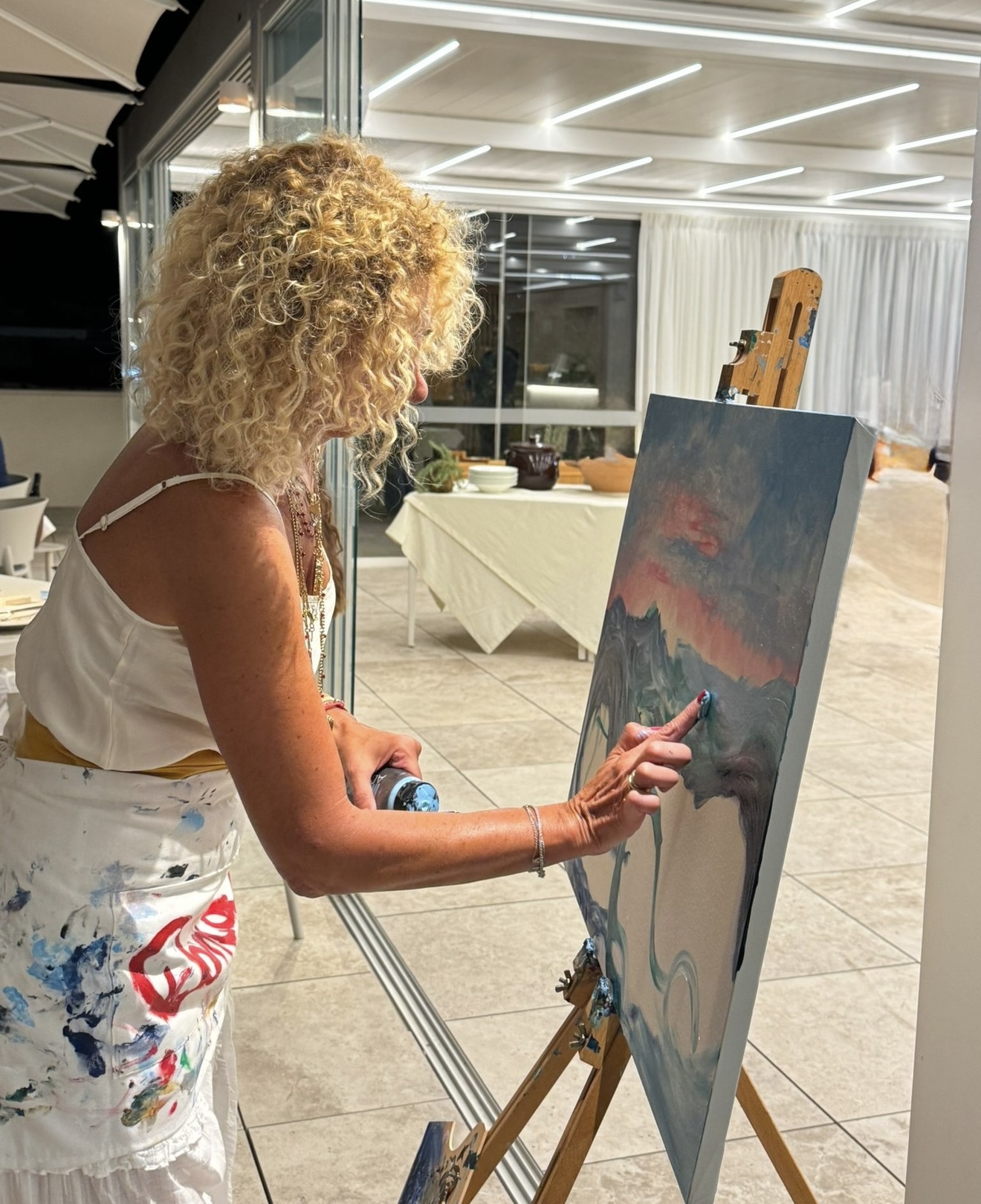Un’arte senza pennelli – Il laboratorio proposto da Dama si distingue per una scelta ben precisa: non vengono utilizzati pennelli né strumenti tradizionali, ma soltanto le mani e le dita. Una tecnica che rompe le regole accademiche per restituire un rapporto diretto, istintivo e profondo con il colore e la materia.