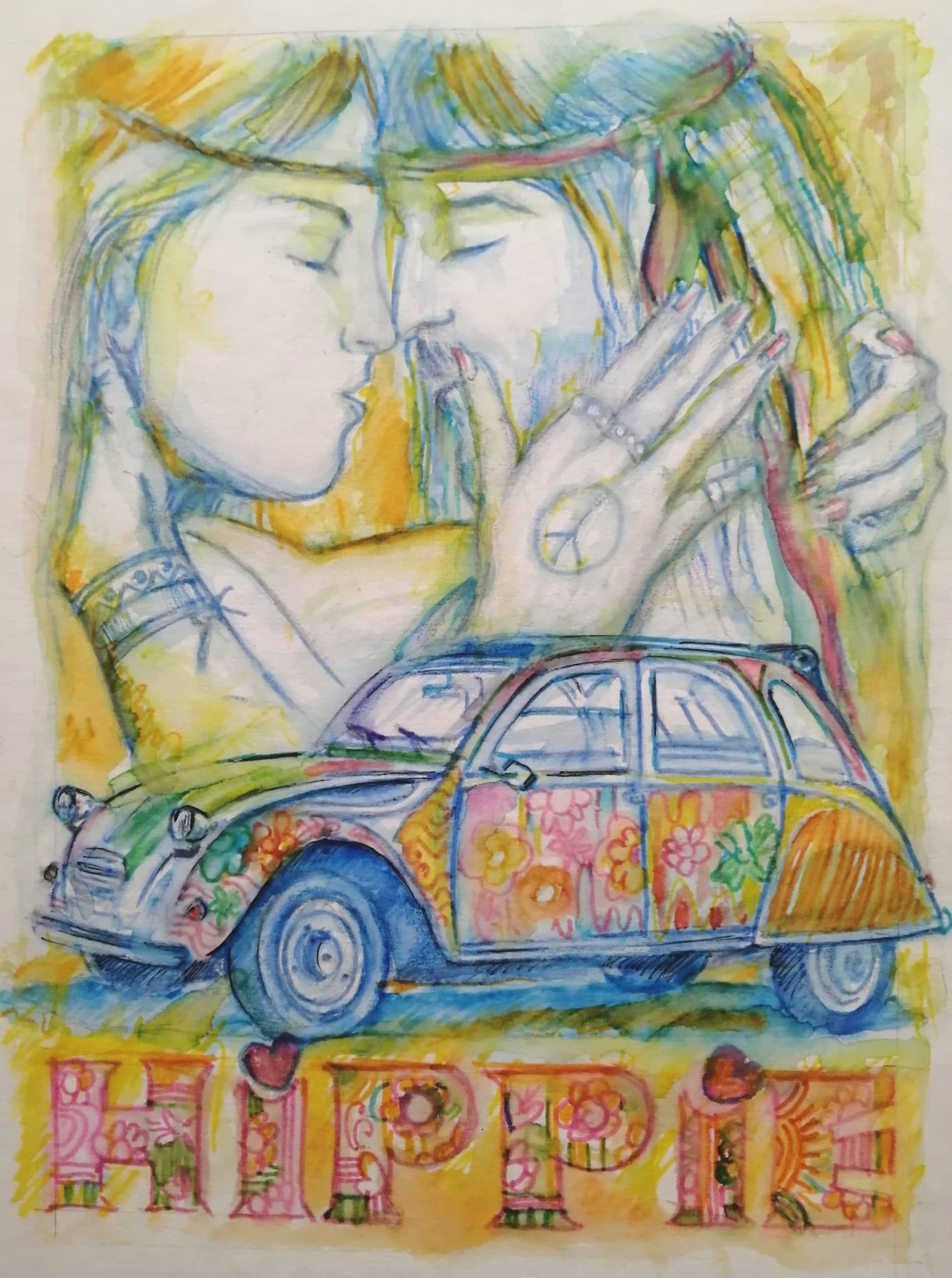 I quadri sono realizzati con dei disegni acquarellati e tecnica mista, come un fumetto di un racconto di quel decennio incredibile che diede inizio a un grande cambiamento sociale e culturale.
